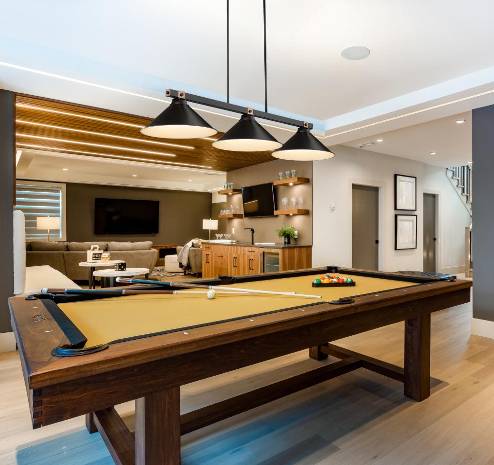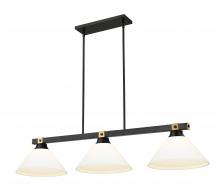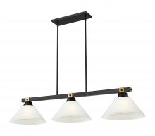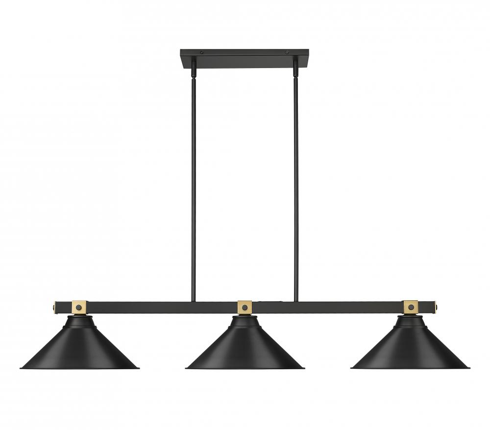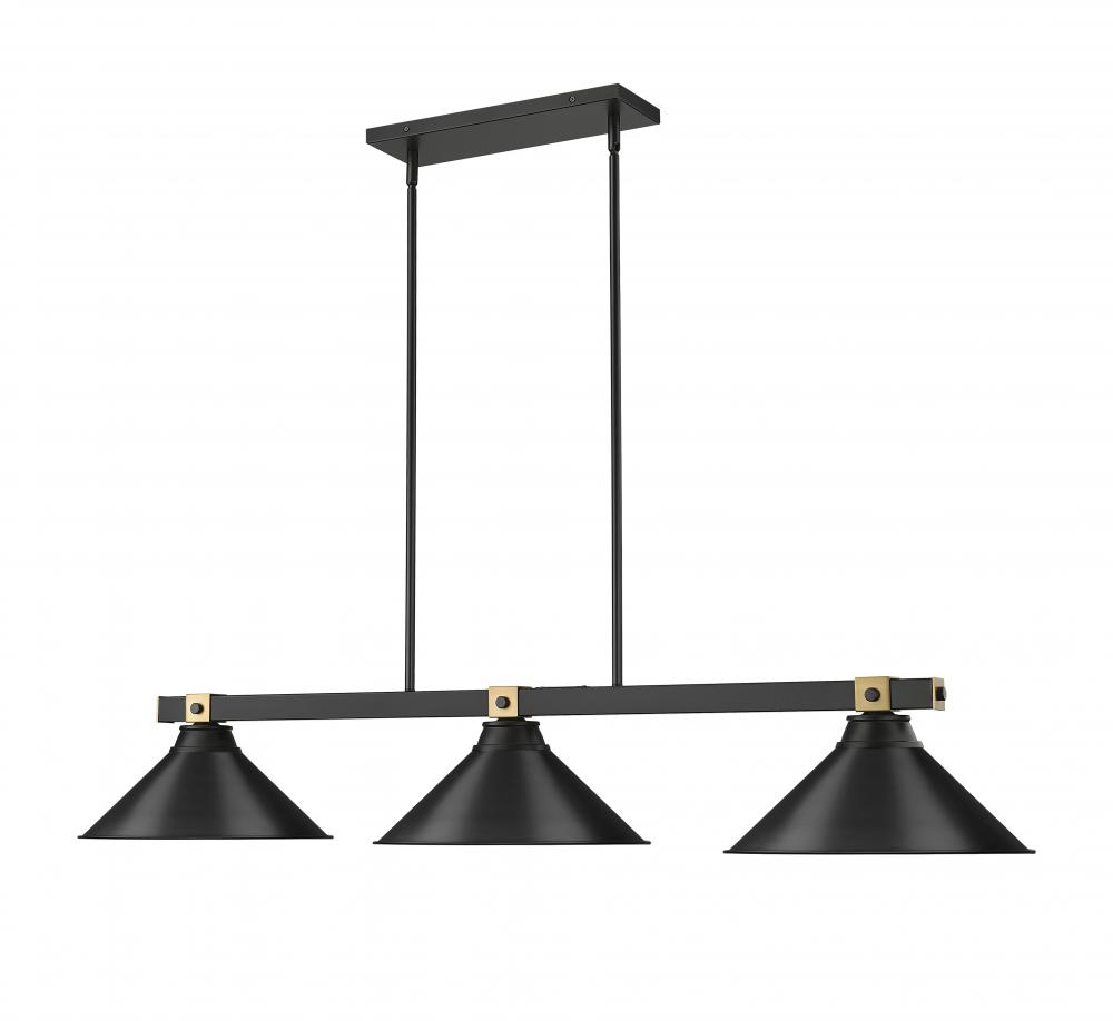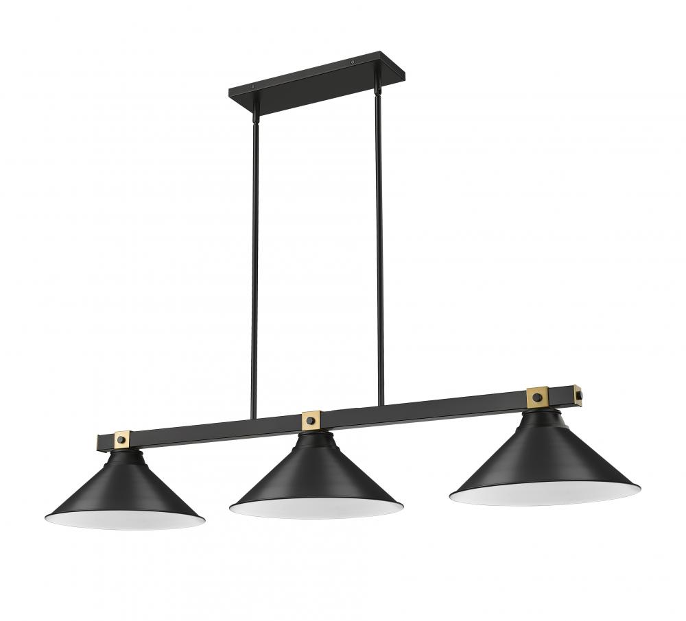 Cool matte black is embellished with rubbed brass accents on this modern three-light billiards pendant. Perfect for games or a dining table, this linear fixture features a clean, simple structure that suits myriad spaces. Lights feature conical shades, each with a white interior for true illumination.