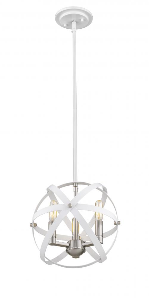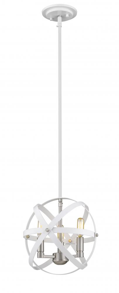 Designed for brilliance, this hanging pendant light is sleek and radiant. Complete with hues of hammered white and brushed nickel, the rings and rods from the open silhouette frame a suspended bouquet of exposed lightbulbs.
