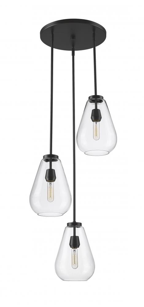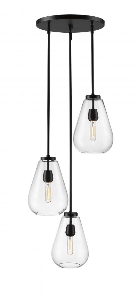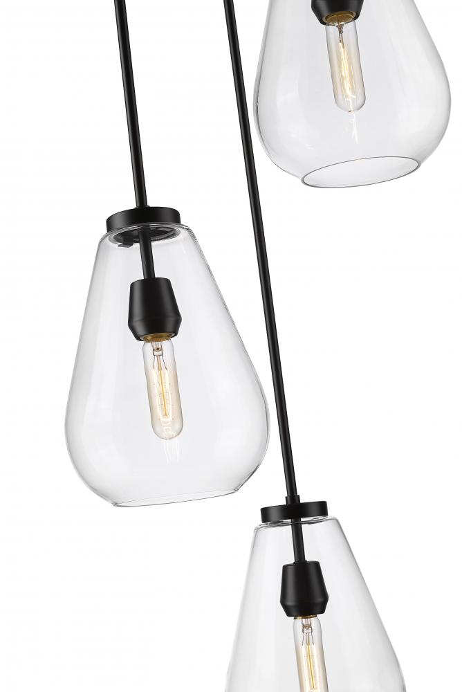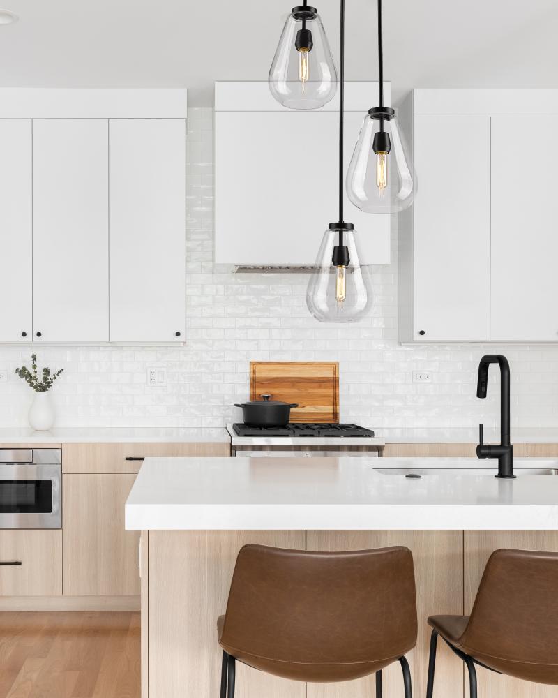 An eye-catching three-light chandelier perfectly encapsulates the modern aesthetic. Tapered bell-shaped shades are made from clear glass, suspended from a sleek steel frame with a matte black finish. The fixture brings a chic cutting edge to a contemporary kitchen or dining room.