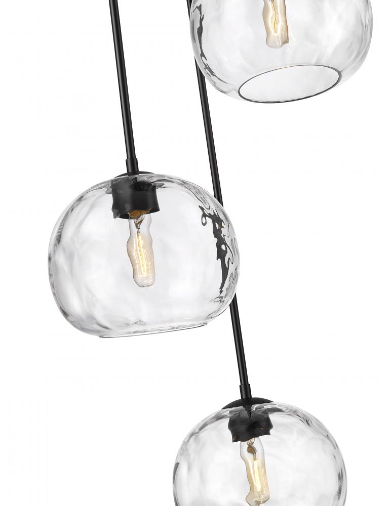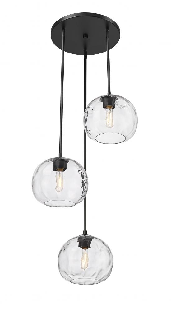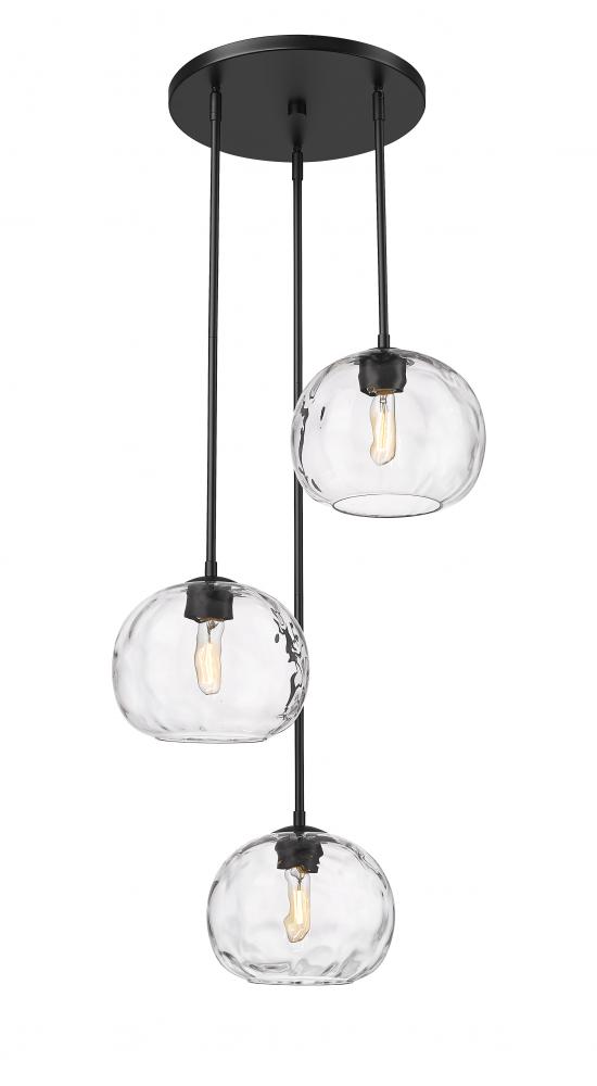 Define your modern space with the eye-catching, streamlined presence of this contemporary three-light chandelier. Rounded shades are made from clear, water-textured glass, suspended from a sleek steel frame with a matte black. Your contemporary dining room or family space gets an instant boost with this sophisticated fixture.