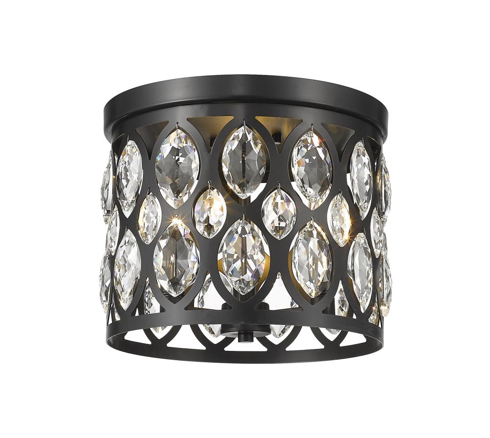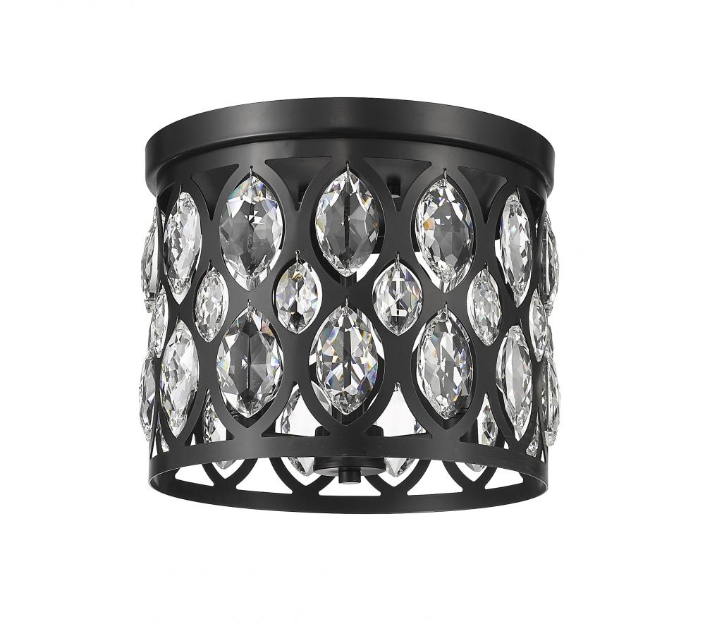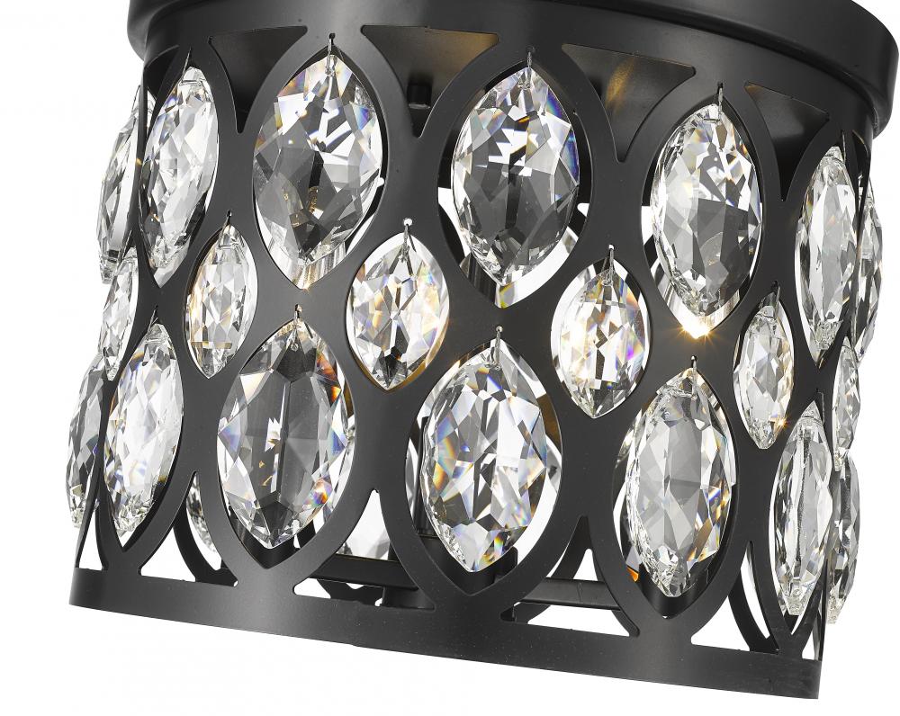 Exquisite and glamorous, this three-light contemporary flush mount ceiling light from the Dealey collection is the perfect addition to a Hollywood Regency style home foyer or hallway between rooms. Featuring a matte black steel shade, complete with striking ellipse-shaped cut outs with glimmering clear crystal pendants, this flush mount light lends a dramatic, contrasting look. With three candelabras set behind the crystals, this low profile fixture also creates a charming fractalized illumination along the walls and footpath.