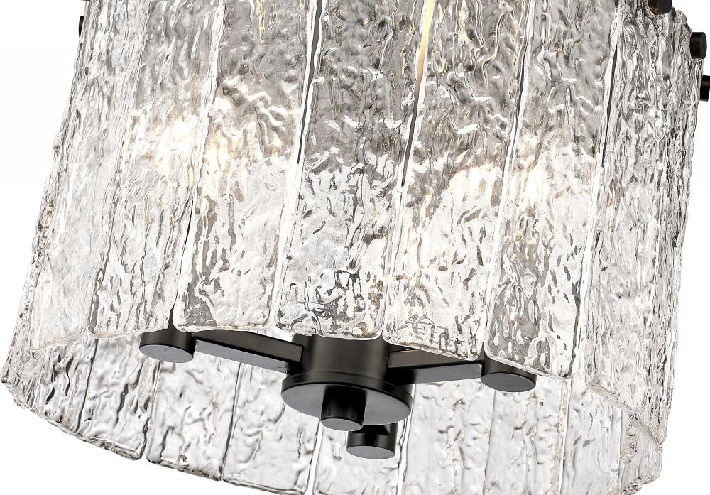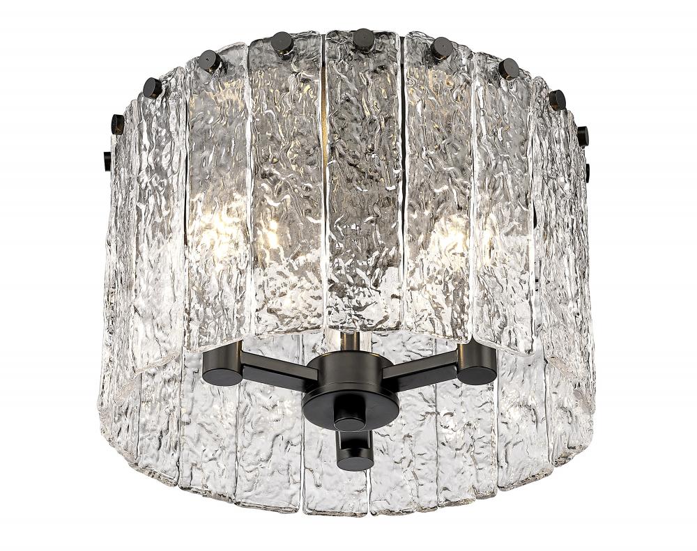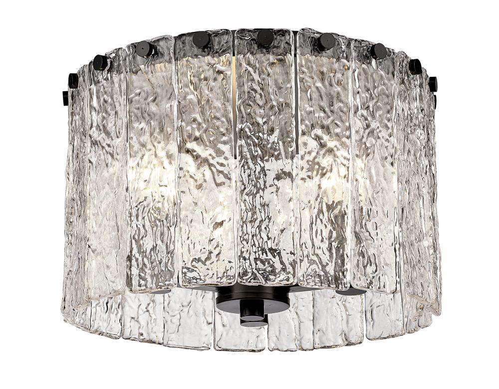 Centered in a decadent custom space, this tasteful three-light flush mount round light becomes a point of interest in a modern or transitional setting. The Glacier round flush mount ceiling light offers a decadent look of individual clear textured glass panels that emulate melting ice, an extraordinary effect with dramatic impact in a kitchen or bar area. Matte black finish steel is texturized and placed as a crown frame, adding a contrast in both style and finish and embellishing the gallery feel of a kitchen or entryway.