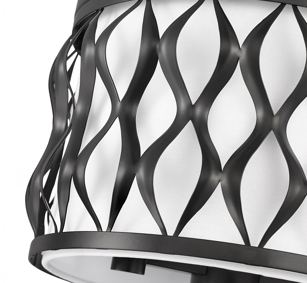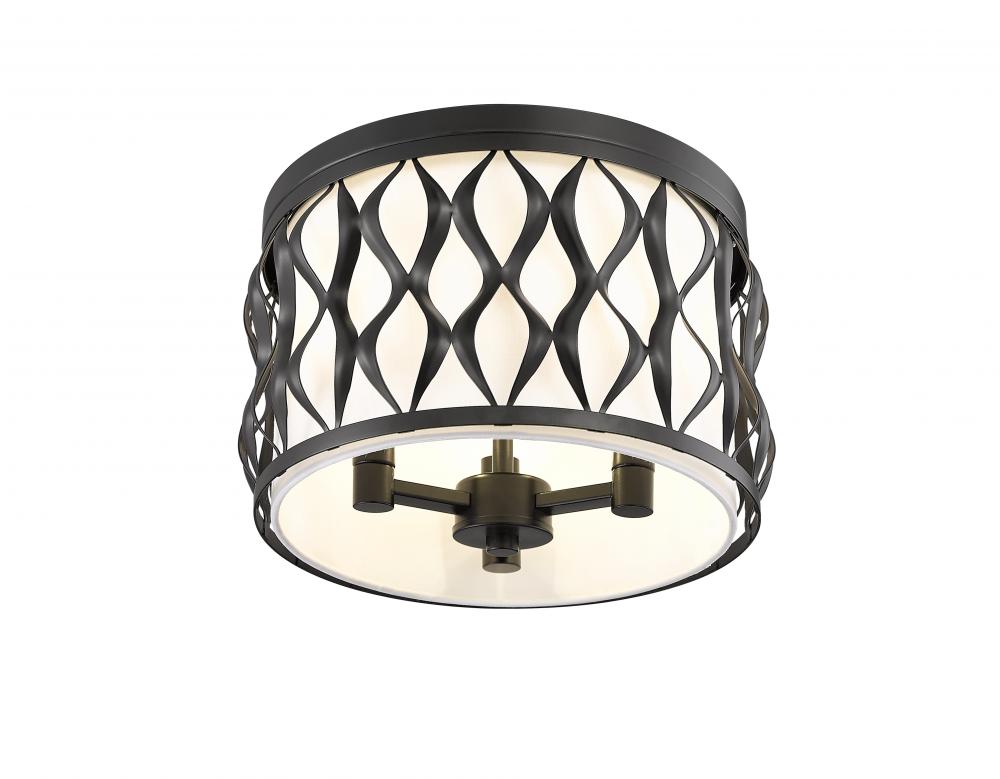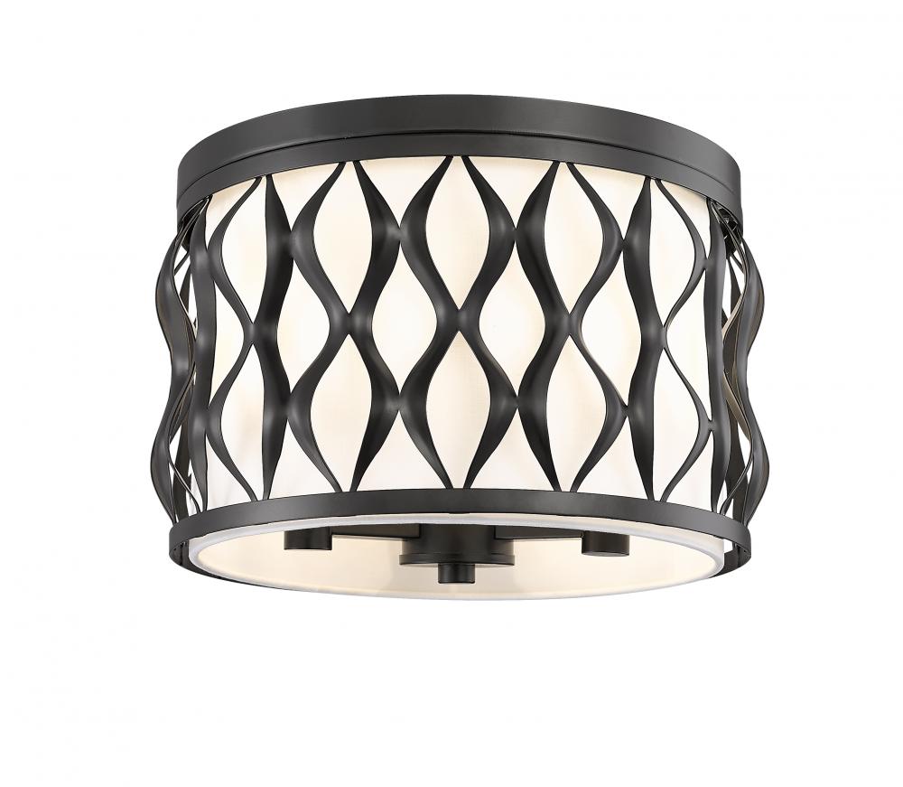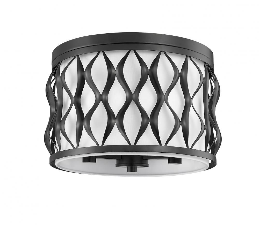 A drum silhouette is crisp and stylish as it enhances this three-light flush mount ceiling light with a timeless metal frame. Ride the vertical waves aligned perfectly around its matte black finish steel frame, and bask in the soft glow of illumination filtered through a white fabric diffuser that eases harsh glare. This dimmable ceiling light offers artistry that becomes a focal point in a kitchen, foyer, or living room.