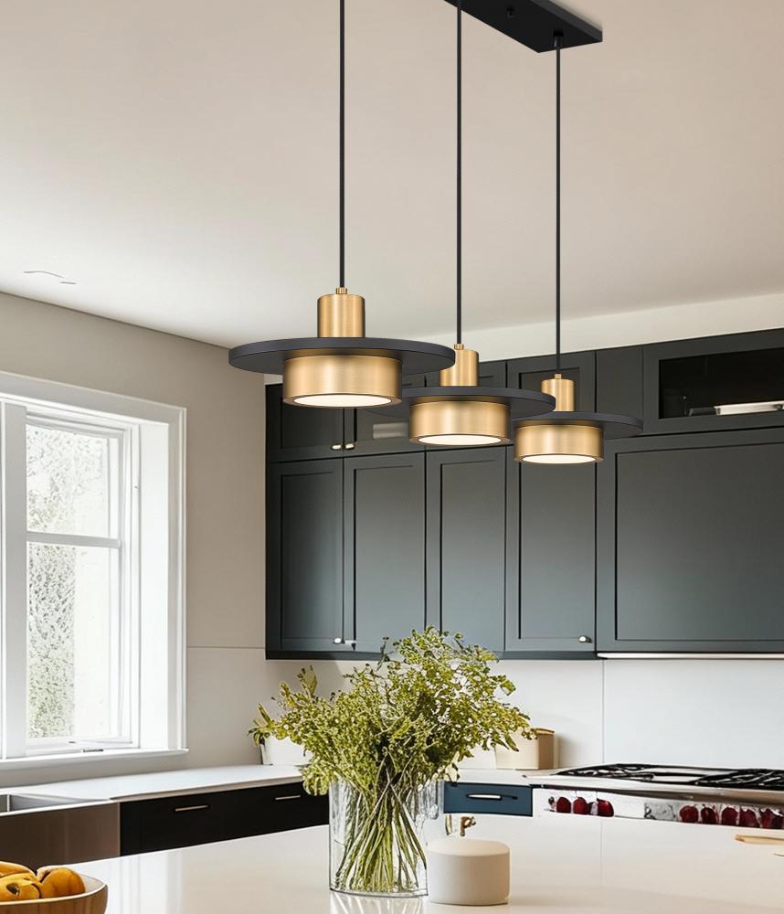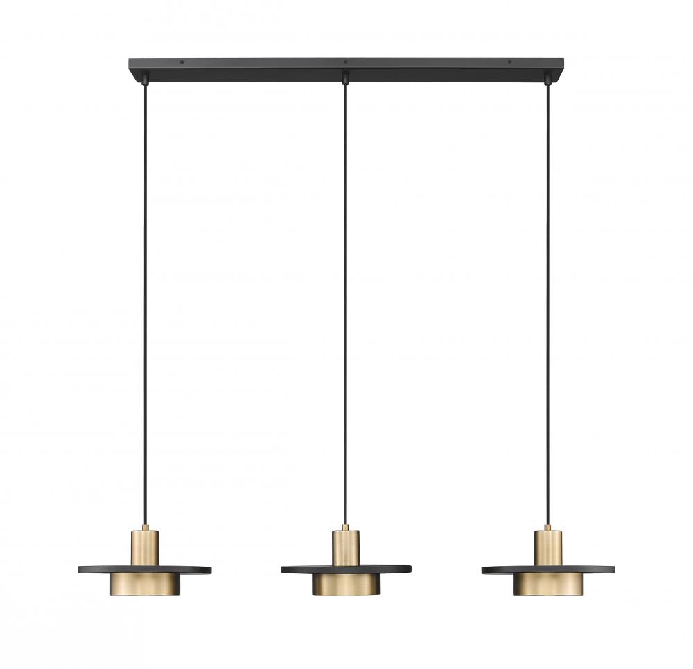 A festive art deco vibe adds pizzazz to this three-light linear chandelier, a tempting option for illuminating horizontally oriented venues. Graduated lengths suspend chic luminaires with matte gold finish framing and modern black finish discs, with black cables and a slender black canopy creating a tasteful and timeless color palette. Dimmable LED lighting makes a difference in a fixture suited for kitchen islands, bar settings, and a host of spaces.