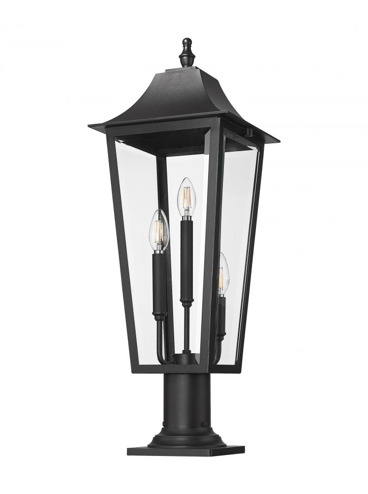 An elongated silhouette brings fresh energy to the timeless details of a traditional three-light outdoor pier mount fixture. Perfect for everything from deck railings to walkways, it offers bright illumination with a trio of candelabra lights and clear beveled glass panes. A Coastal black finish completes the look with impressive durability to highlight a charming sloped top that adds to its familiar profile.