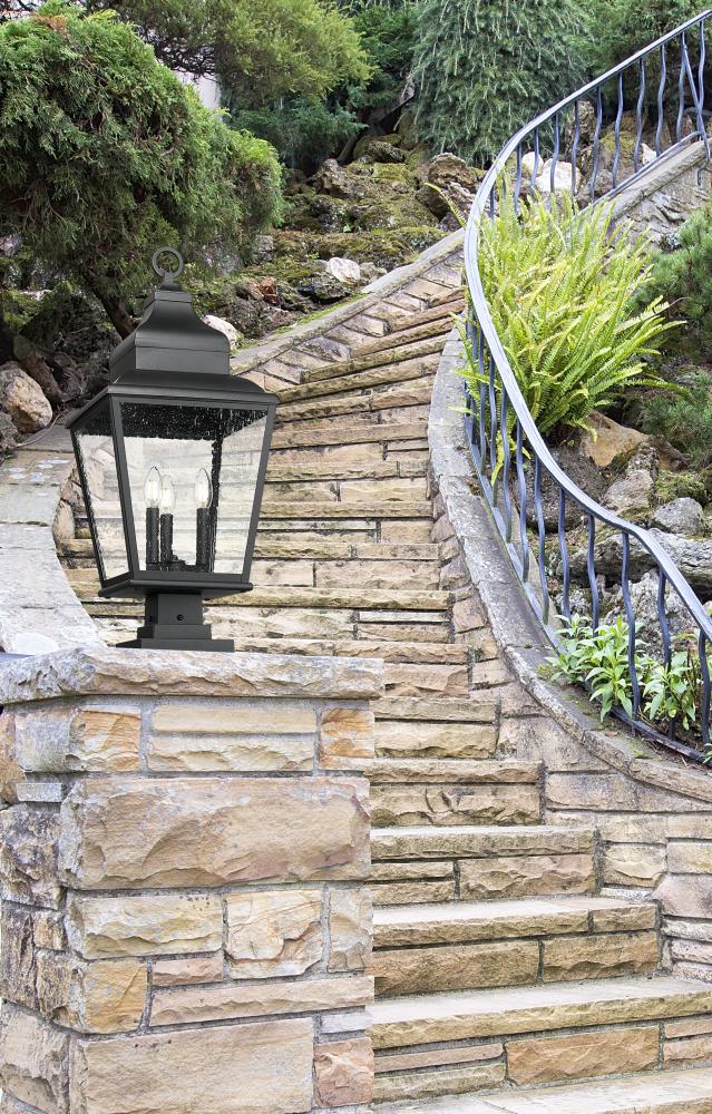Modeled after a timeless lantern motif, this three-light outdoor pier-mounted fixture makes a romantic design statement in yard spaces and custom gardens. Soft sand black finish aluminum construction forms a gently tapered silhouette, with a bevy of ornate detailing and clear seedy glass panels. Interior candelabra-style bulb mounts infuse dimmable lighting to alter the mood of any space.