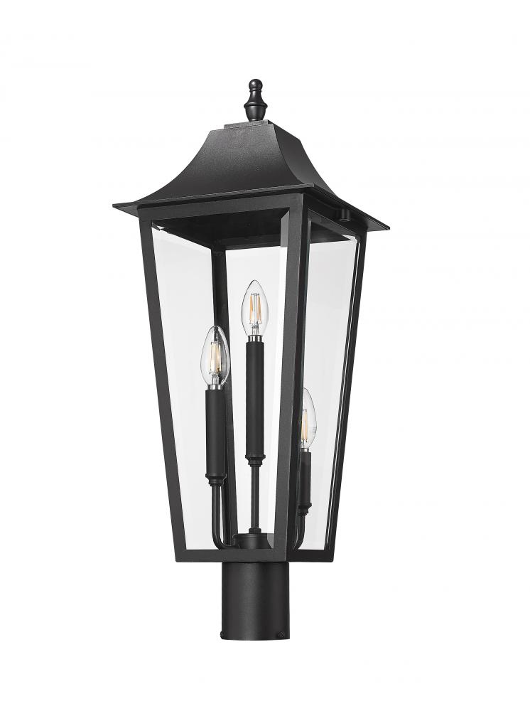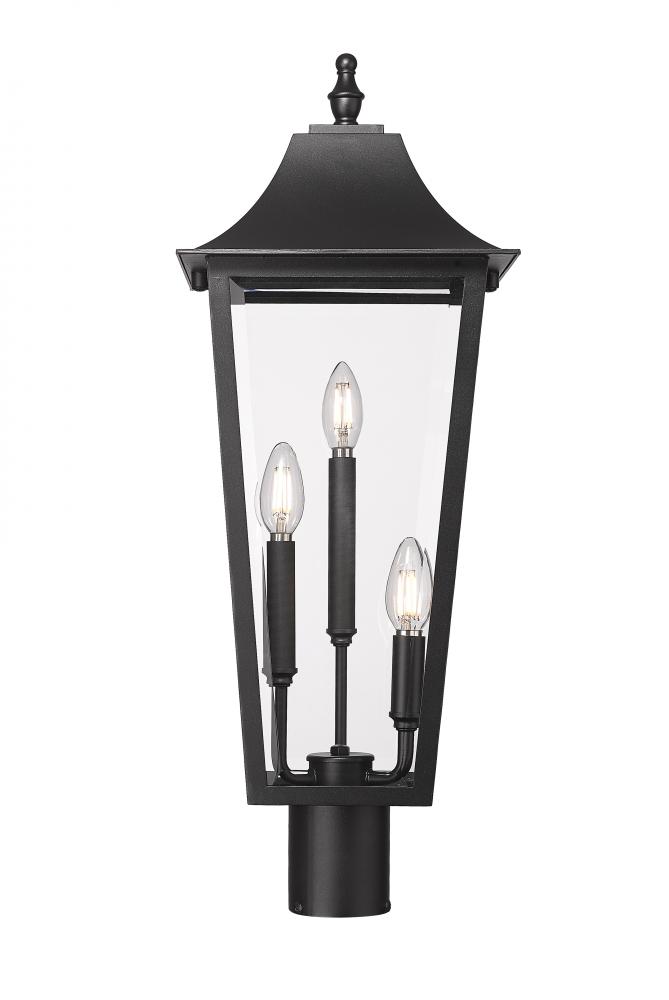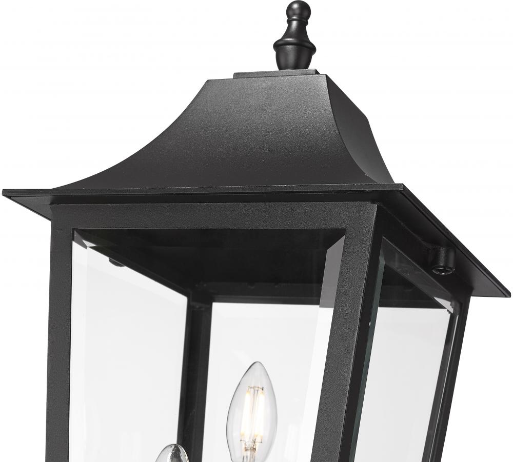 Bring fresh energy to the timeless details of a traditional three-light outdoor post mount fixture with its elongated silhouette. It complements beautifully in every setting, from deck railings to walkways, with a Coastal black finish thats durable and refined. This charming fixture offers bright illumination with three candelabra lights and clear beveled glass panes that add depth and dimension.