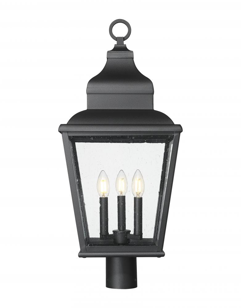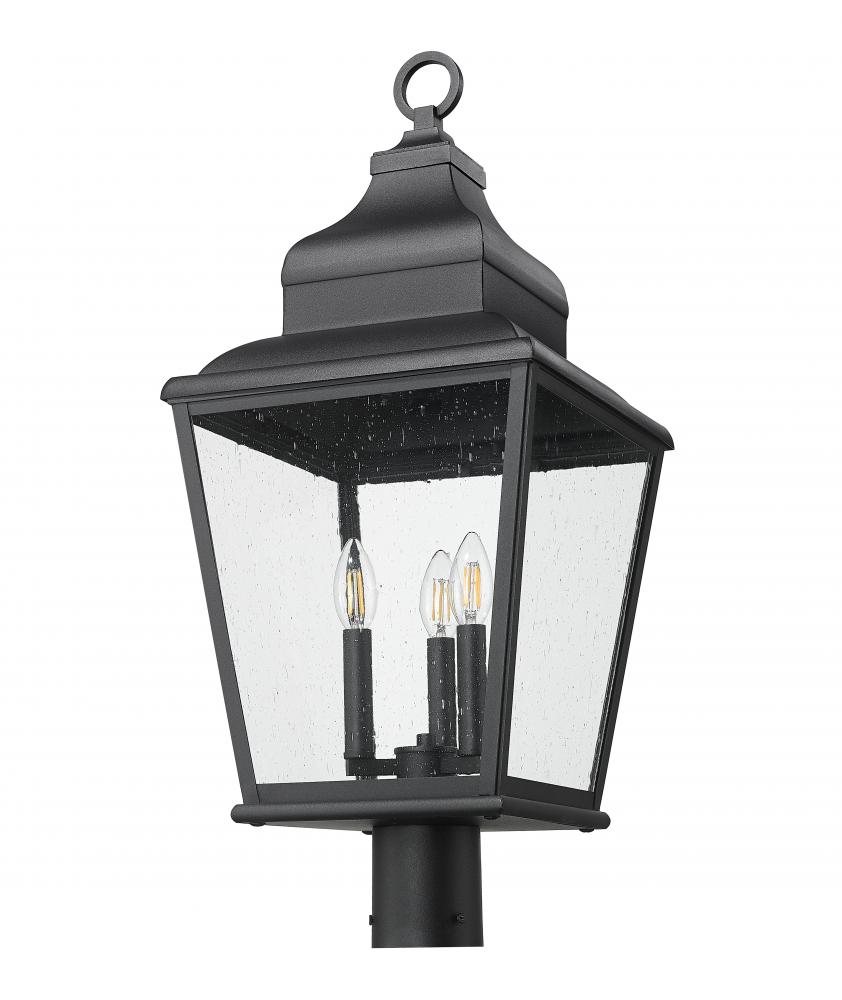 Artisan accents embellish the romantic design of this three-light outdoor post-mounted fixture, making it a superb choice for custom exterior settings. With a lantern-inspired silhouette, its aluminum construction with a soft sand black finish is pleasing to the eye, with clear seedy glass panels revealing interior candelabra-style holders adding romantic charm. Dimming features create moody effects for round-the-clock illumination.