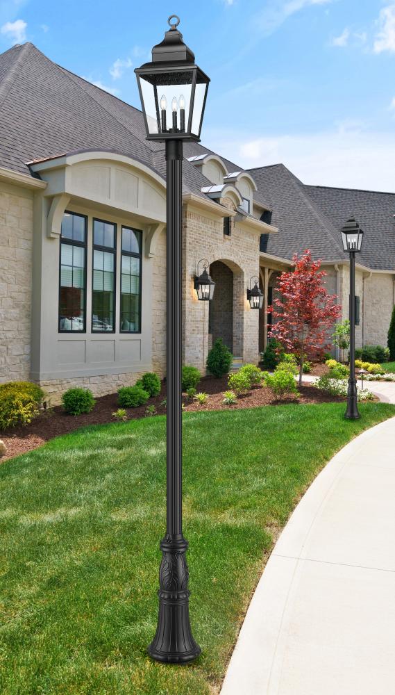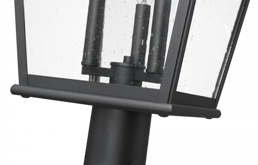 Top a post mount with a romantic, classic three-light outdoor fixture made of sand black finish aluminum and clear seedy glass panels. Drawing on a timeless design, this outdoor light features a tapered silhouette, excess detail on its cap, and charming interior candelabra-style bulb mounts. Dimmability embellishes this post light, allowing for time-of-day accommodations.