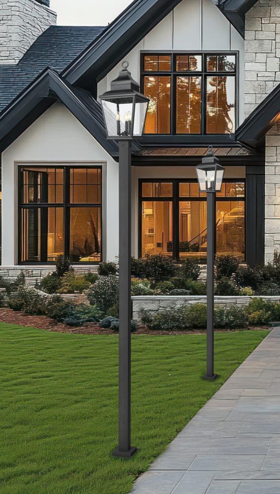 Soft sand black finish aluminum begins the elegant look of a three-light outdoor post mount fixture youll want to consider. An iconic village motif dressed up with ornate detail embellishes any yard or walkway, with clear seedy glass shade panels offering a mystical quality. This outdoor light features dimming functionality for light level adjustment.