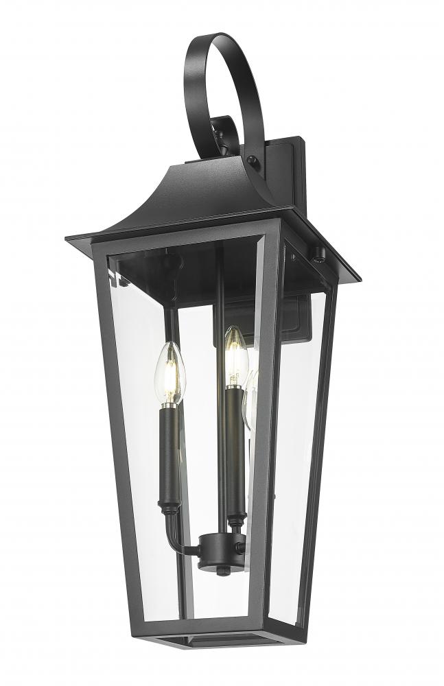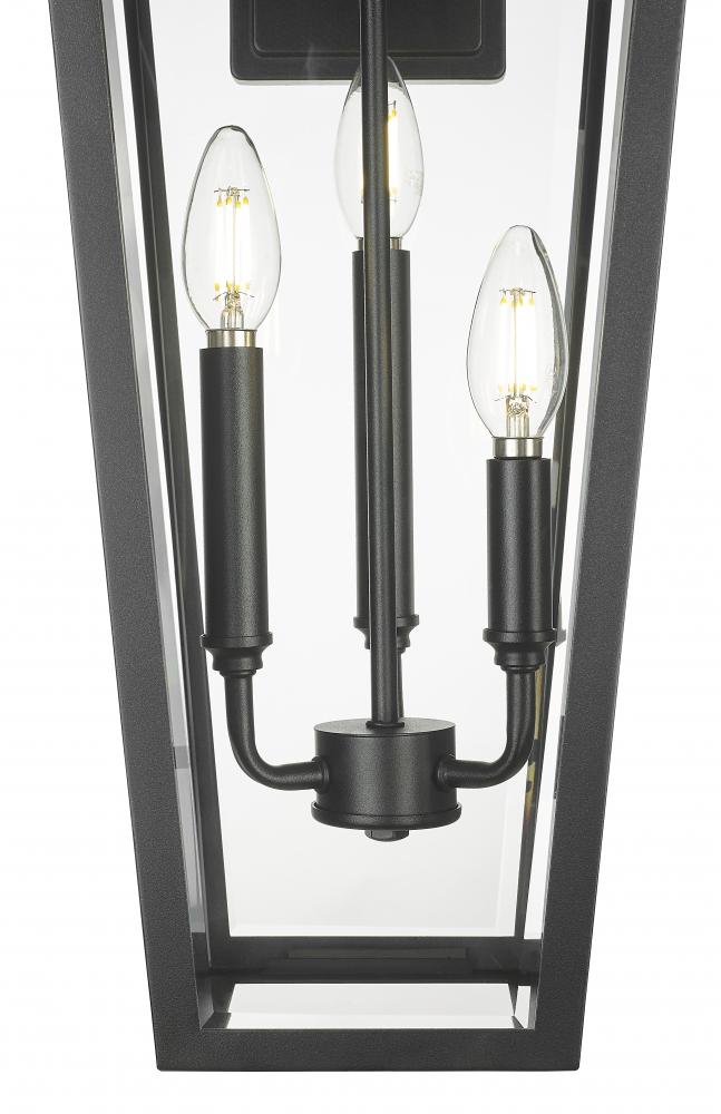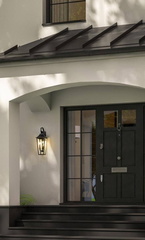 A sleek scroll arm and elongated silhouette become the stylish hallmarks of a traditional three-light outdoor wall light. In durable Coastal black over stainless steel construction, it boasts clear beveled glass panels for bright illumination on a porch or patio. This stylish fixture offers a refined, cohesive look to your exterior.
