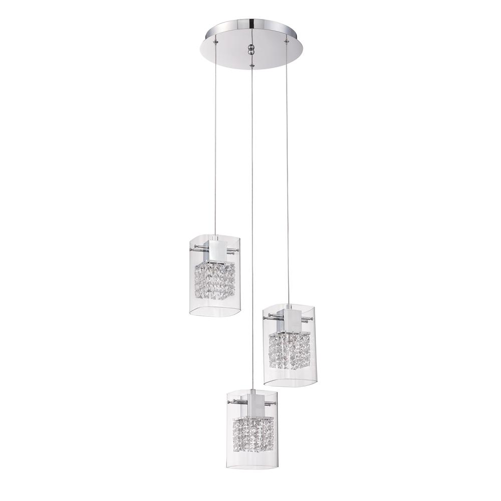 3 Light Pan in a Chrome finish with clear outer glass shades surrounding chains of Optic Crystal suspended in a cube pattern