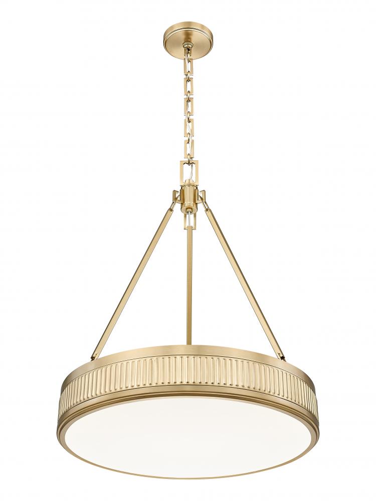 Fluted bands emphasize the sophistication that radiates from a modern three-light LED pendant. Its a shallow drum silhouette complete with an energy efficient Z-Lite EZ change LED module thats light color selectable and dimmable. The fixture is complete with a rich modern gold finish for pleasing elegance over a seating group or dining table.