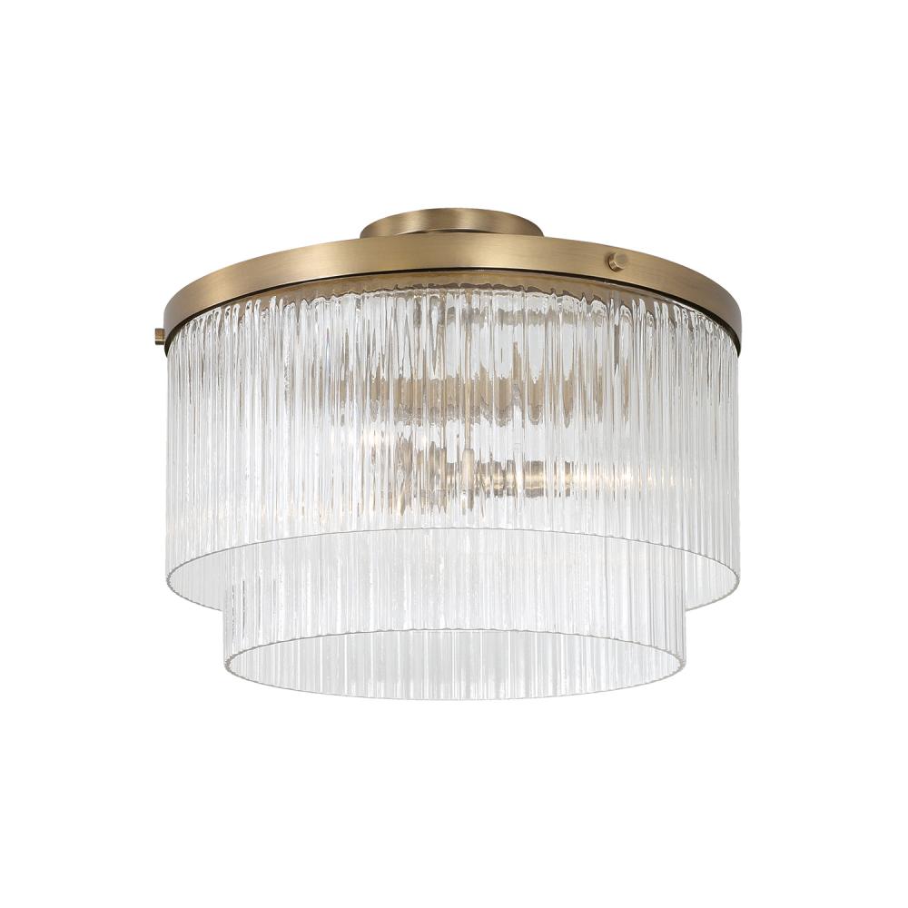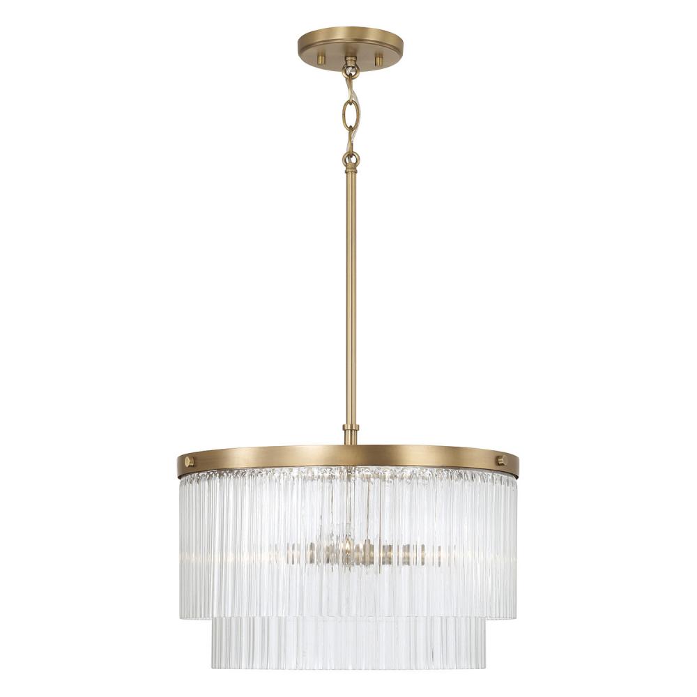 DETAILS: Unique Beveled Fluted glass illuminates stunning texture while the Aged Brass finish creates a classic aesthetic. Can be hung as a pendant or semi-flush.