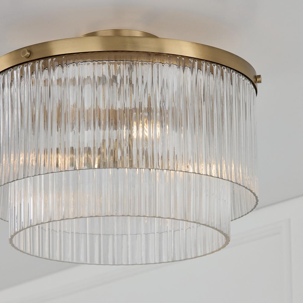 Invite stunning illumination to any space with the Vaughn Dual Mount Pendant or Semi-Flush. Whether hung as a pendant or semi flush, the Beveled Fluted glass creates captivating texture against the tiered cylindrical silhouette, while the Aged Brass finish offers a versatile, timeless aesthetic.