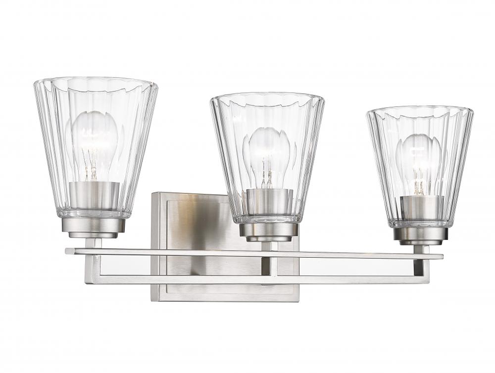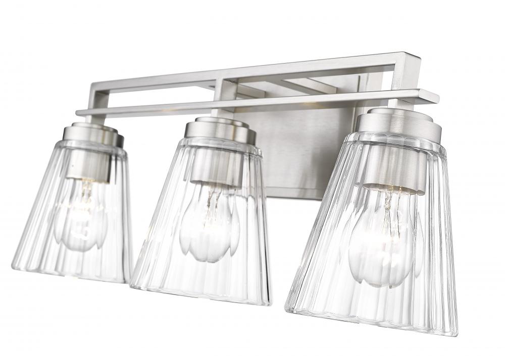 A design statement perfect for contemporary bathrooms is in reach with this three-light vanity light from the Lyna collection. Sheer romance reflects in a pair of sparkling clear ribbed glass cone shades and a detailed steel frame with a brushed nickel finish. Add this light as a complement to an ensuite or guest bath vanity.