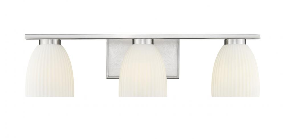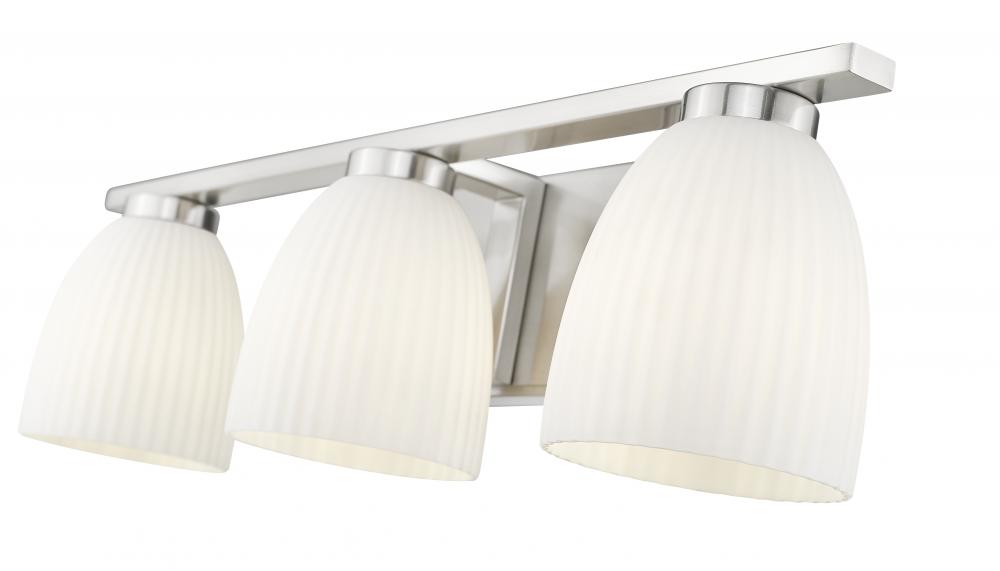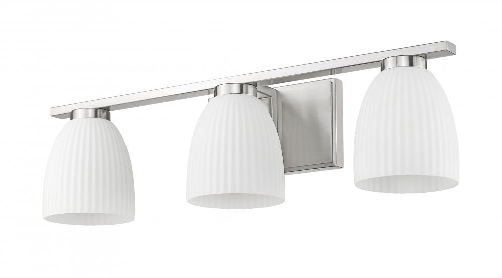 Sleek and serene, this three-light vanity fixture pairs a brushed nickel finish with ribbed matte opal glass for an effortlessly polished look. The trio of lights glows softly, creating an atmosphere that feels clean, bright, and calm. It?s a versatile choice for morning routines and evening wind-downs alike.