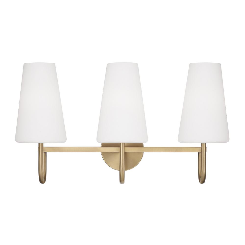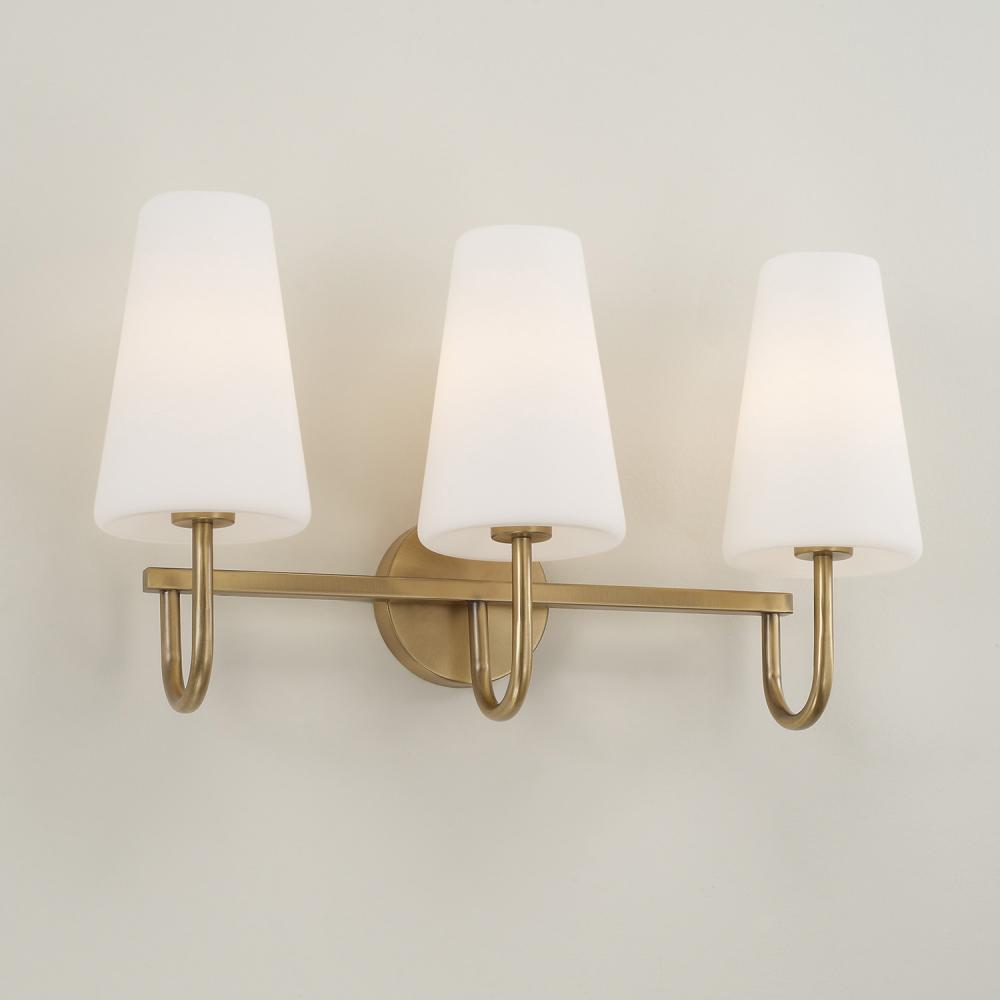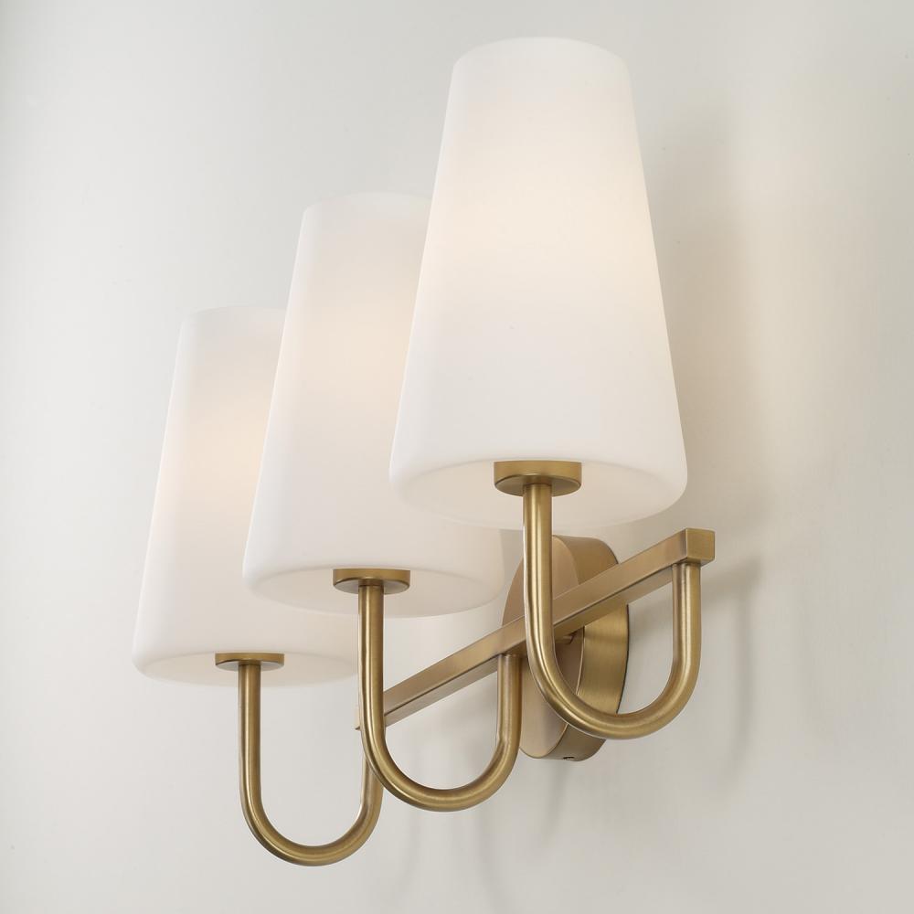 DETAILS: Elongated Soft White glass shades and sleek Aged Brass details bring an elegant aesthetic to the large-scale silhouette.