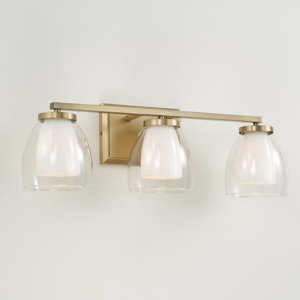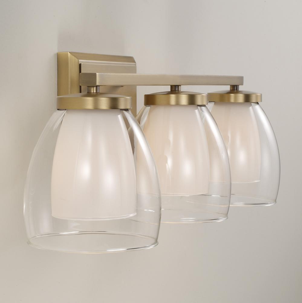 DETAILS: Layered Soft White and Clear glass create glamour and intrigue, while the Aged Brass finish offers a warm, refined shine.
