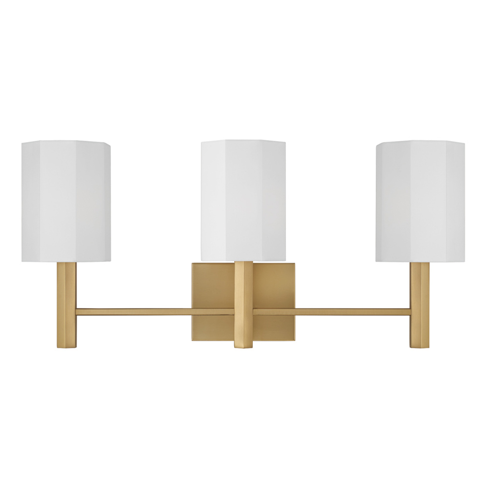 DETAILS: Finished in Aged Brass, the faceted candle sleeves and octagonal White fabric shades bring beautiful dimension to the classic form.