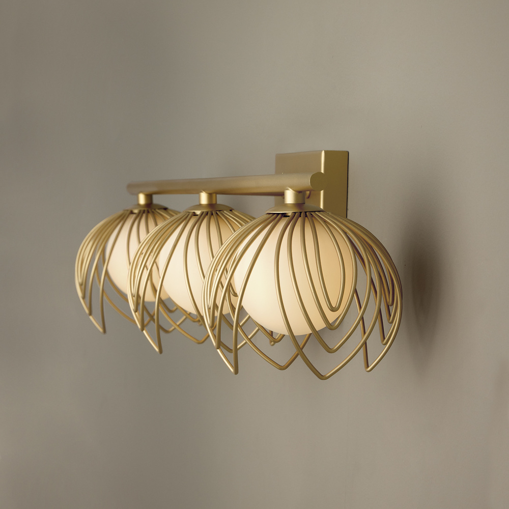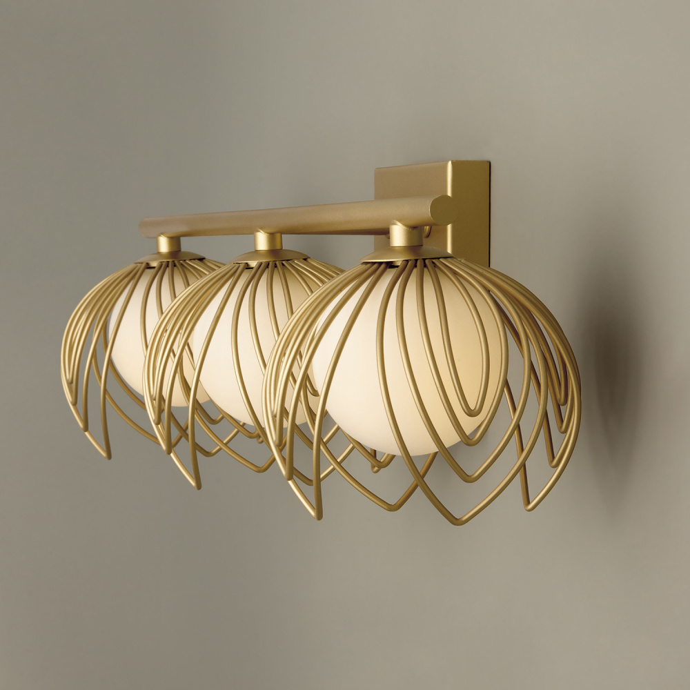 DETAILS: Delicate, pointed metal flower petals surround Soft White glass globes, bringing botanical ambiance with a warm, Buffed Gold finish.