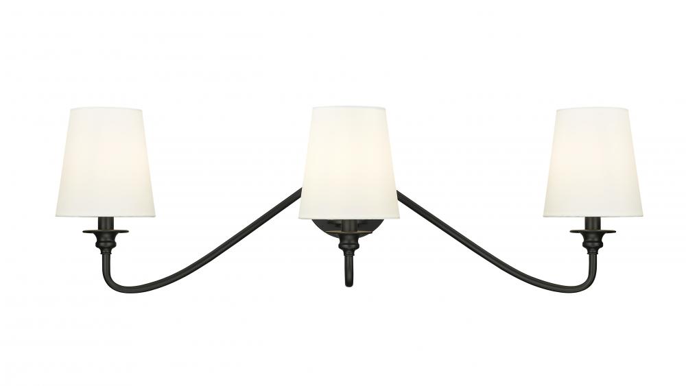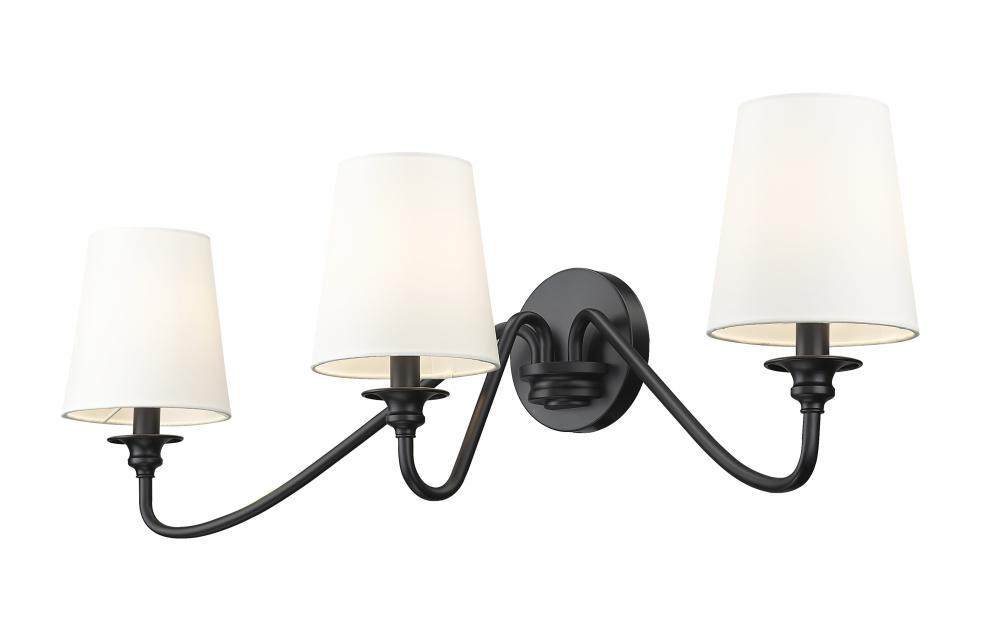 Create a rich, welcoming ambiance in a family room or foyer with a modern three-light wall sconce. Designed for impeccable, refined style, it features a trio of curvy arms emerging from a compact round wall plate, all in a crisp matte black finish that creates a sense of distinction. Three opaque white shades add a modern empire silhouette, perfect for a variety of spaces.