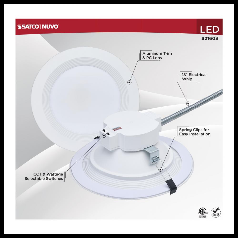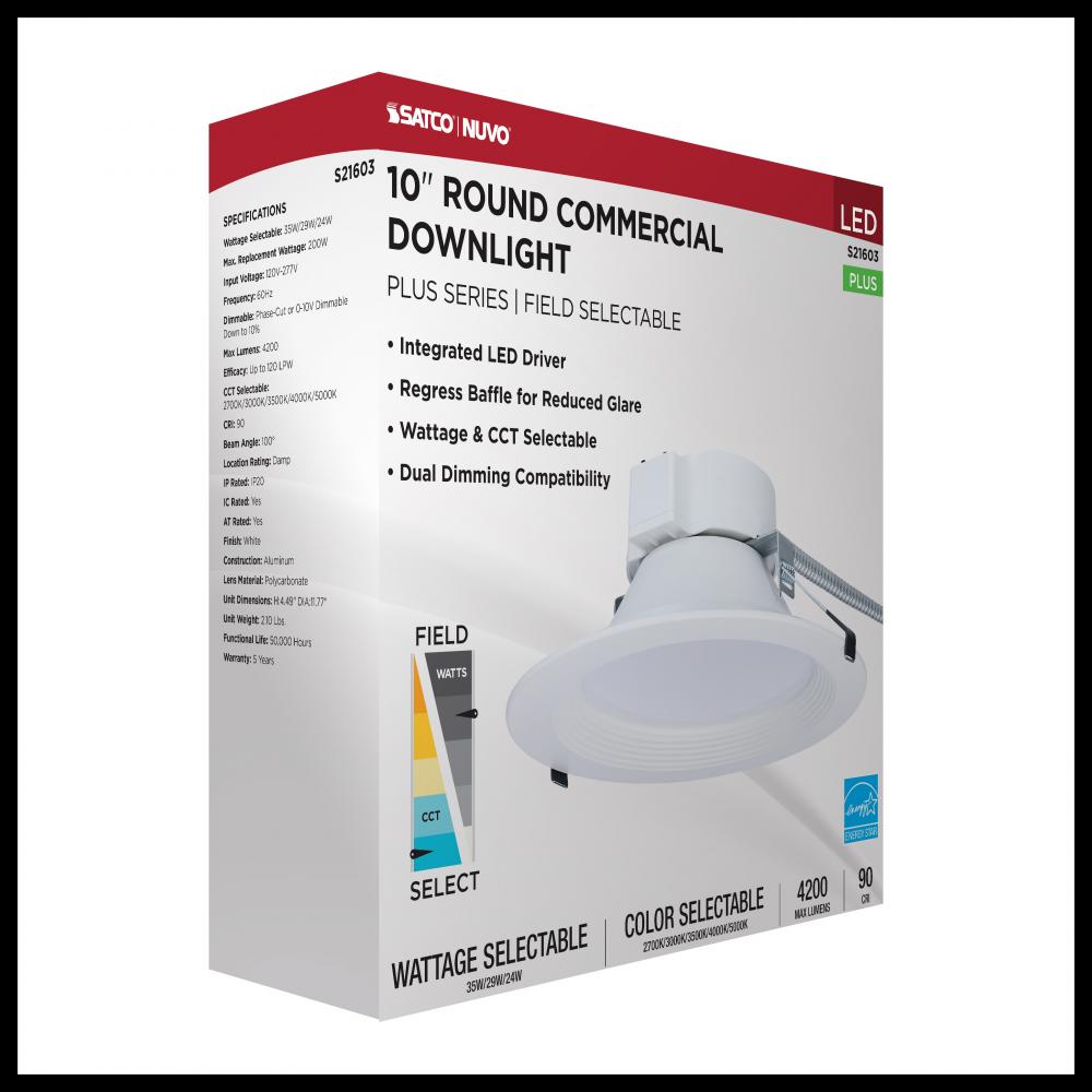 SATCO NUVO's Plus Series LED Commercial Downlight, S21603, delivers exceptional performance and versatility for today's remodel or new construction commercial environments. This 10-inch round fixture features field-selectable wattage and CCT settin