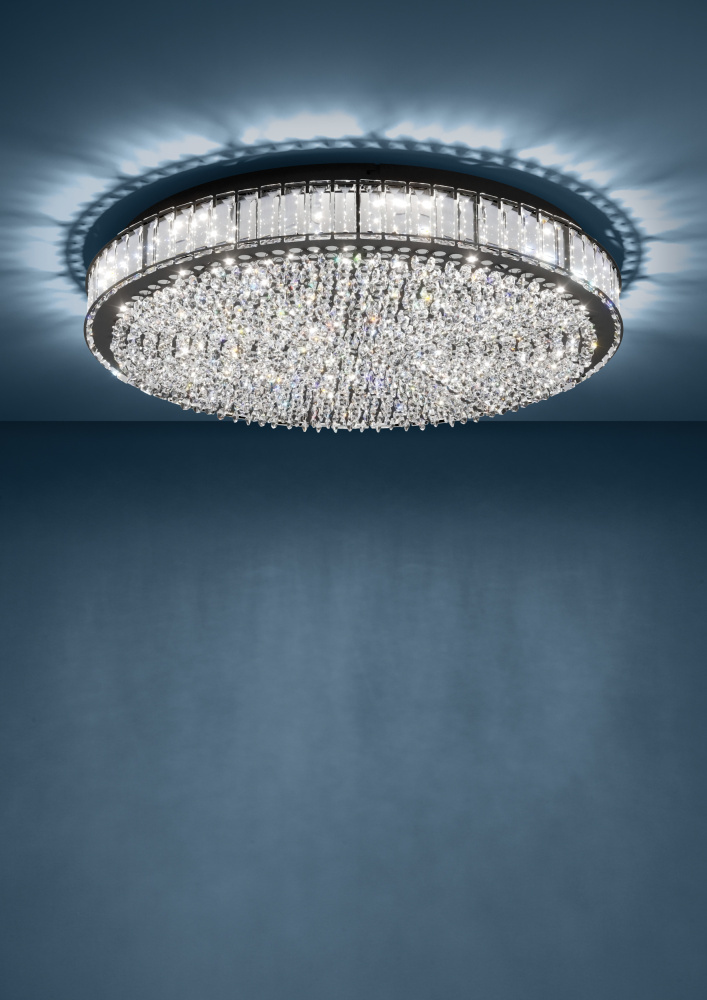 The BALPARDA LED ceiling light has a black finish souronded by a plethora of clear crystals. The high-end glass crystals hanging from the light create a sparkling, high-quality look. The integrated LEDs produce a neutral white light. The ceiling light blends seamlessly with modern styles, providing glamorous lighting in any space.