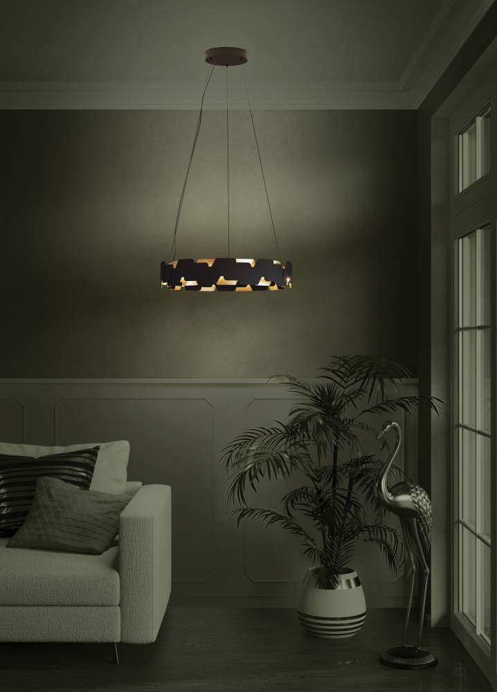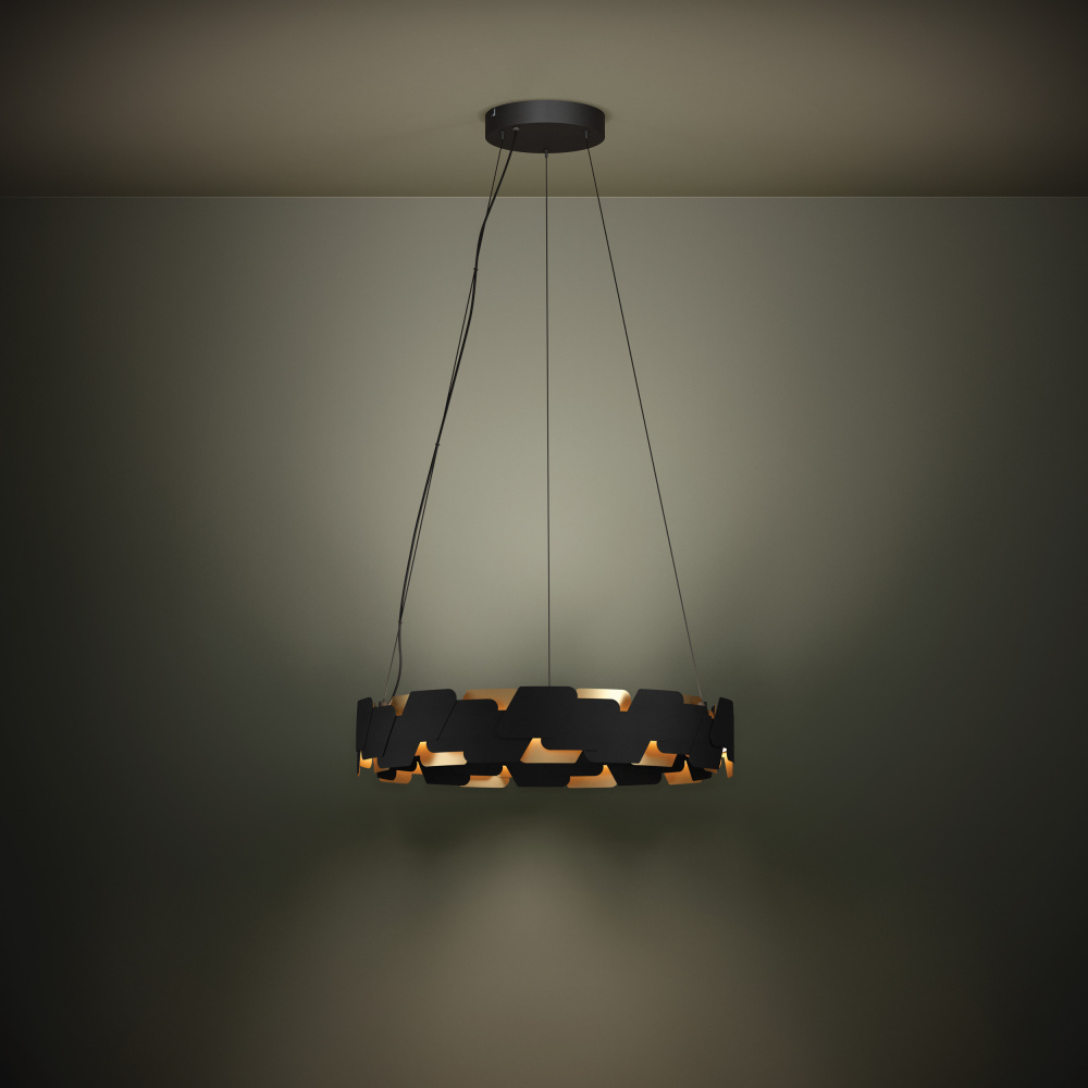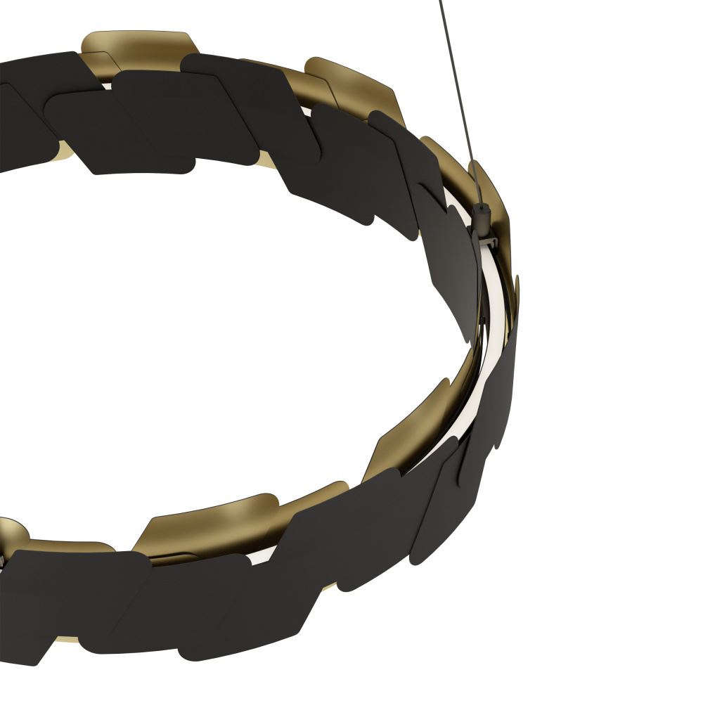 The ALTAGRACIA LED pendant features a circular metal body w/ a gold and black finish in an offset pattern. The integrated LEDs between the geometric metal shade cast a warm white light upwards and downwards. The pendant creates a distinctive, eye-catching feature in any space