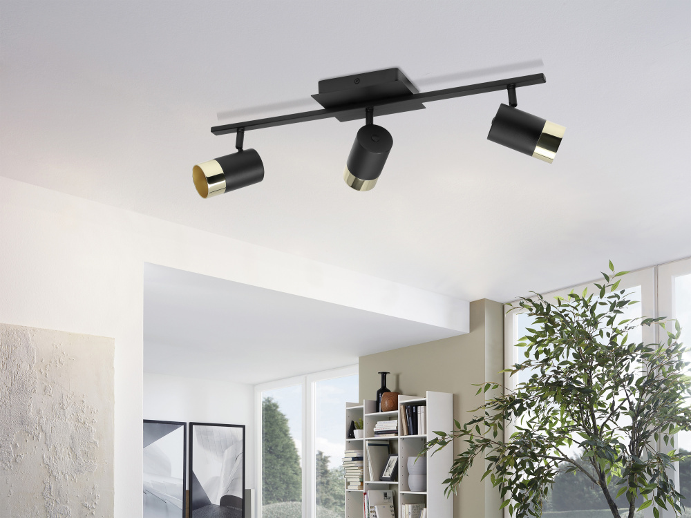 The TOMARES 3 light fixed track light consists of a rectangular, black metal body. Three movable, cylindrical black lamp heads are attached to the body, each combined with a gold accent. The integrated LEDs emit pleasant warm white light. With its stylish color mix of black and gold, can be perfectly integrated into modern interiors. The pivoting spotlights allow you to create individual lighting accents in the room—