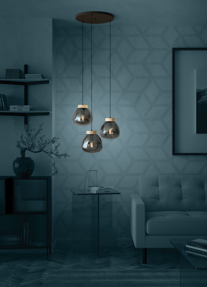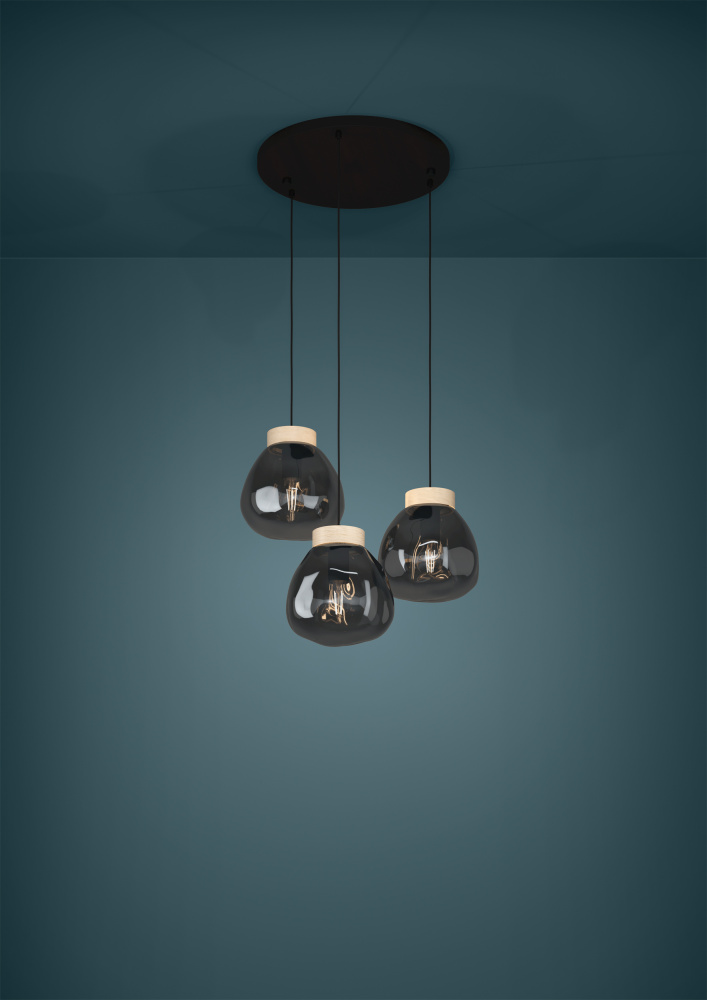 The Magacela three-light round pendant is a perfect mix of natural and prestigious materials. Composed of organically shaped smoked glass shades with a lightly metallic finish and wood accents, this timeless suspended light fits elegantly with modern and contemporary designs. Whether in the kitchen or dining room, this three-light pendant will add the right amount of charm.