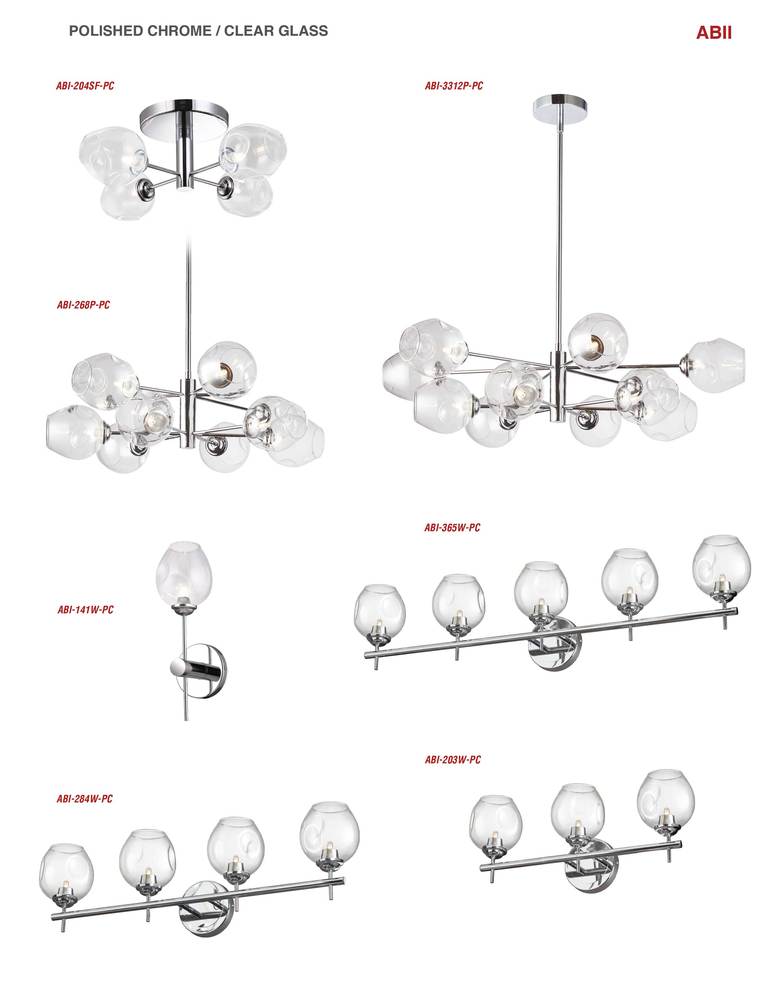 The eye-catching contrast of glass globes and sleek straight lines form the basis of the ABII family of lighting fixtures. It's a versatile and adaptable design with options ranging from a single sconce to a large pendant light in a look that can work with virtually any room or design scheme. The metal base and arms create a pattern to showcase the reflective effects of the glass globes. Colorway options include complementary finishes from warm to stylishly dramatic. Halogen lights add a warm glow. From ultra-modern minimalism to mid-century and even more traditional décors, the ABII family of lighting’s transitional design is both luxurious and timeless in its appeal.