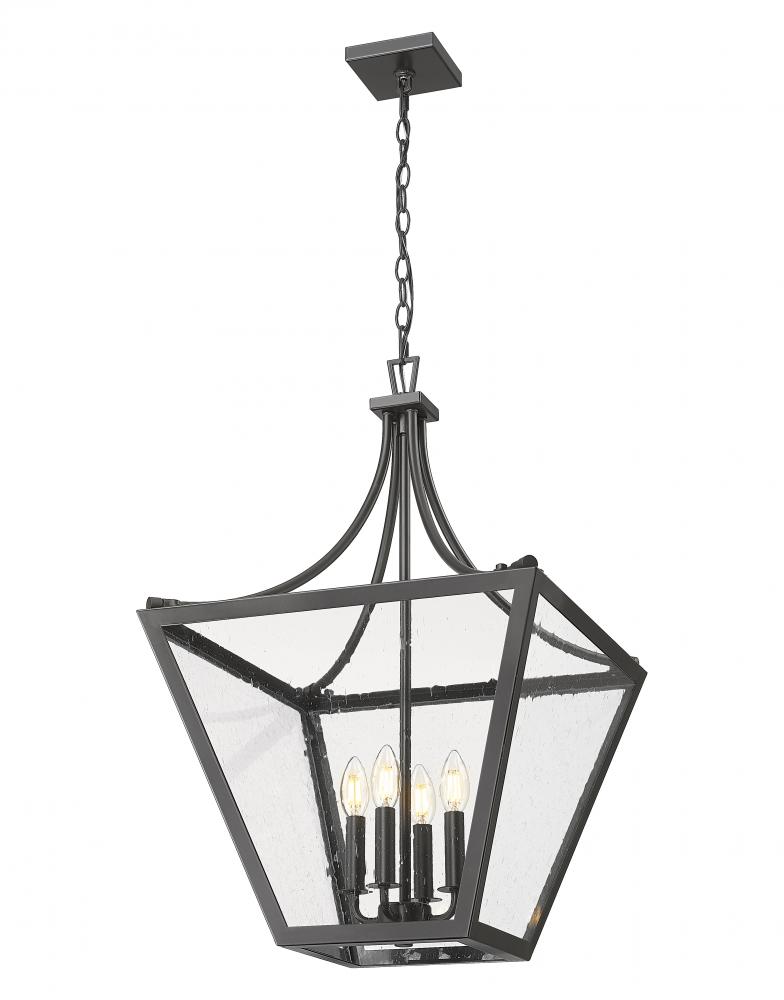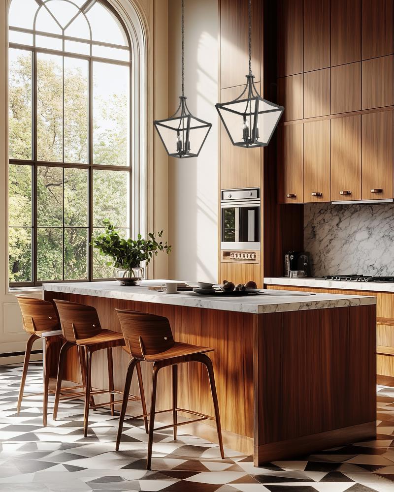 A chic twist on the timeless lantern motif comes through in a four-light chandelier made of iron ore finish steel with slightly seedy glass panels. An interesting silhouette adapts to creative shaping, offering an artisan light source with interior candelabra style bulb mounts. This dimmable light fixture offers customized levels of illumination to suit special needs.