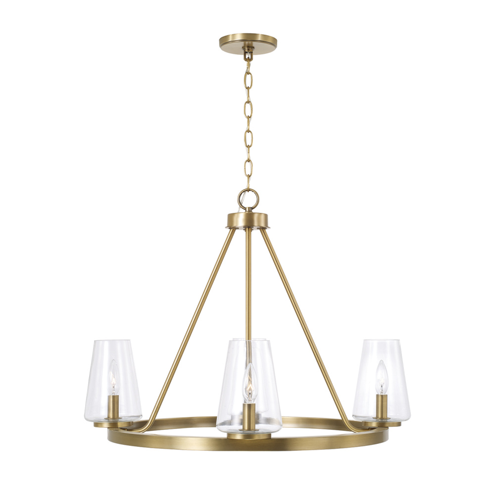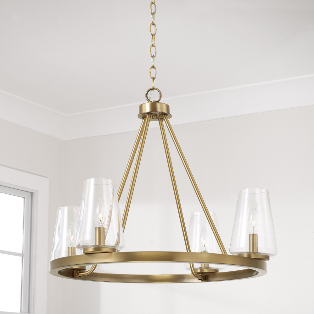 DETAILS: In a traditional ring silhouette, the tapered clear glass shades create classic style with an elegant Aged Brass finish.