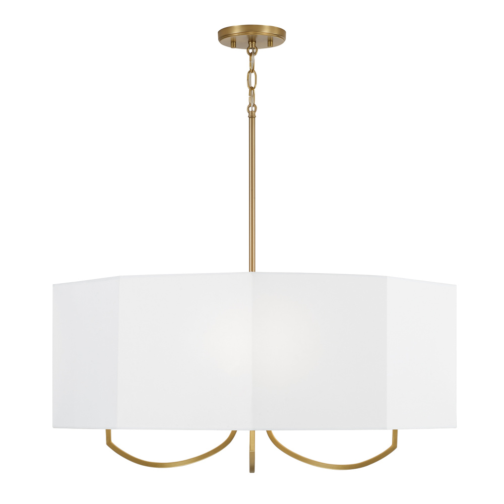 DETAILS: Finished in Aged Brass, the faceted candle sleeves and octagonal White fabric shade bring beautiful dimension to the classic drum silhouette.
