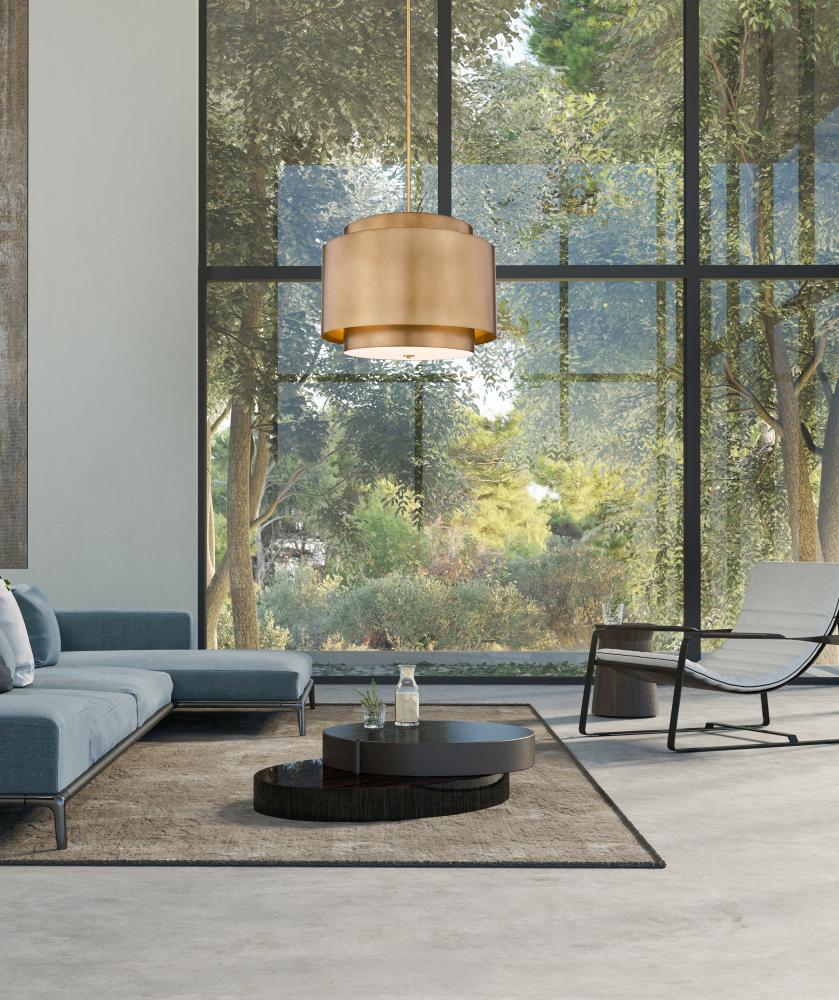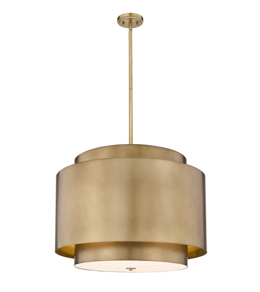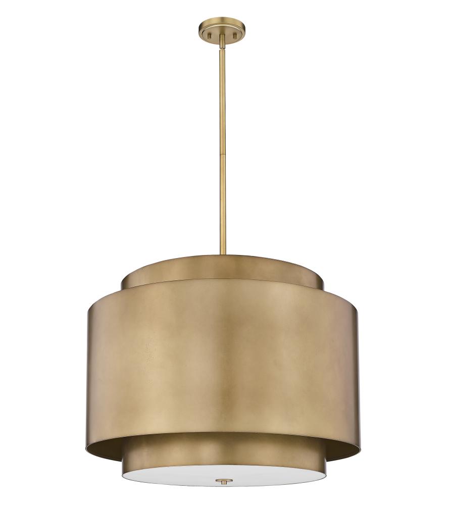 A bold, designer look, the impressive Harlech collection four-light pendant delivers a charming layered, double pendant design. It skirts the line between modern and industrial design motifs, creating a charming, character rich addition. Perfect for the foyer or over a breakfast nook, the pendant boasts a warm rubbed brass inner drum, with a shorter, wider drum layered on top for a dimensional look and feel.