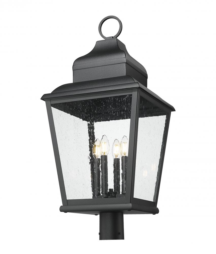 Romantic with a village aesthetic, this four-light outdoor post-mount fixture brings a romantic personality as it illuminates yards and garden spaces. A soft sand black finish over aluminum construction highlights ornate detail, with a lantern-like silhouette and clear seedy glass panels creating an enticing look. Clustered candle holders softly glow with dimmable lighting, perfect for meeting illumination needs around the clock.