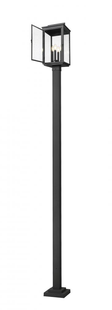 A charming handle reinforces the character-rich depth and details featured on a traditional Mission four-light outdoor post mount light fixture. Perfect for creating curb appeal, it features a marine-grade sand black finish with subtle texture that adds dimensionality. The lantern includes candelabra lights and clear seedy glass that adds the perfect hint of texture.