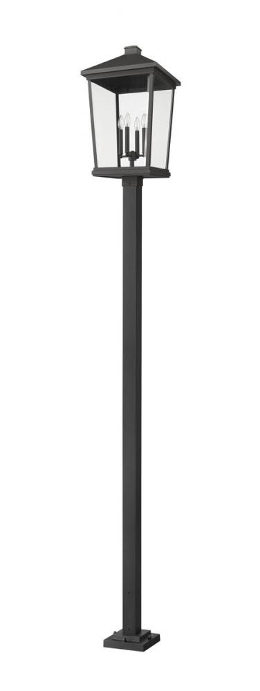 Keep it simple and classic with this four-light outdoor post mounted fixture from the Beacon collection. Transitional and modern motifs merge to create a sophisticated light and post from cool matte black finish aluminum. Clear beveled glass panels show through to candelabra-style bulb mounts, offering a tasteful design-forward look with village-influenced charm.