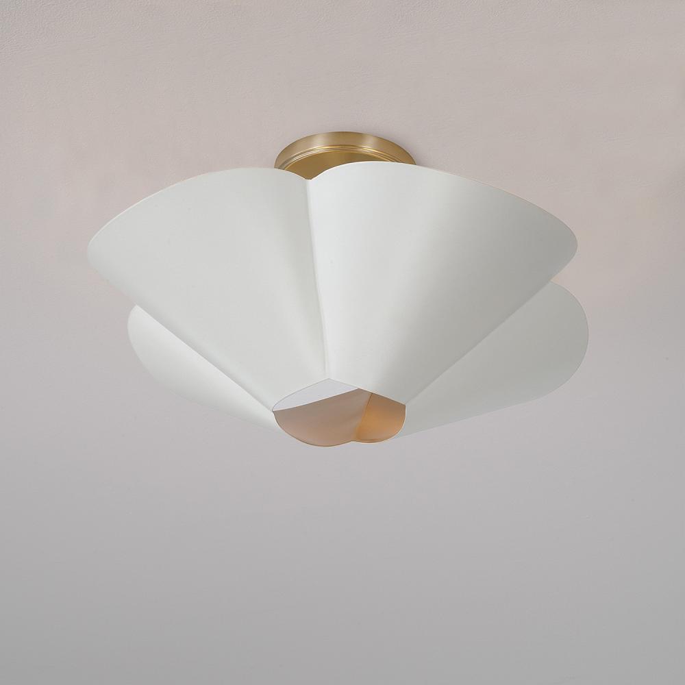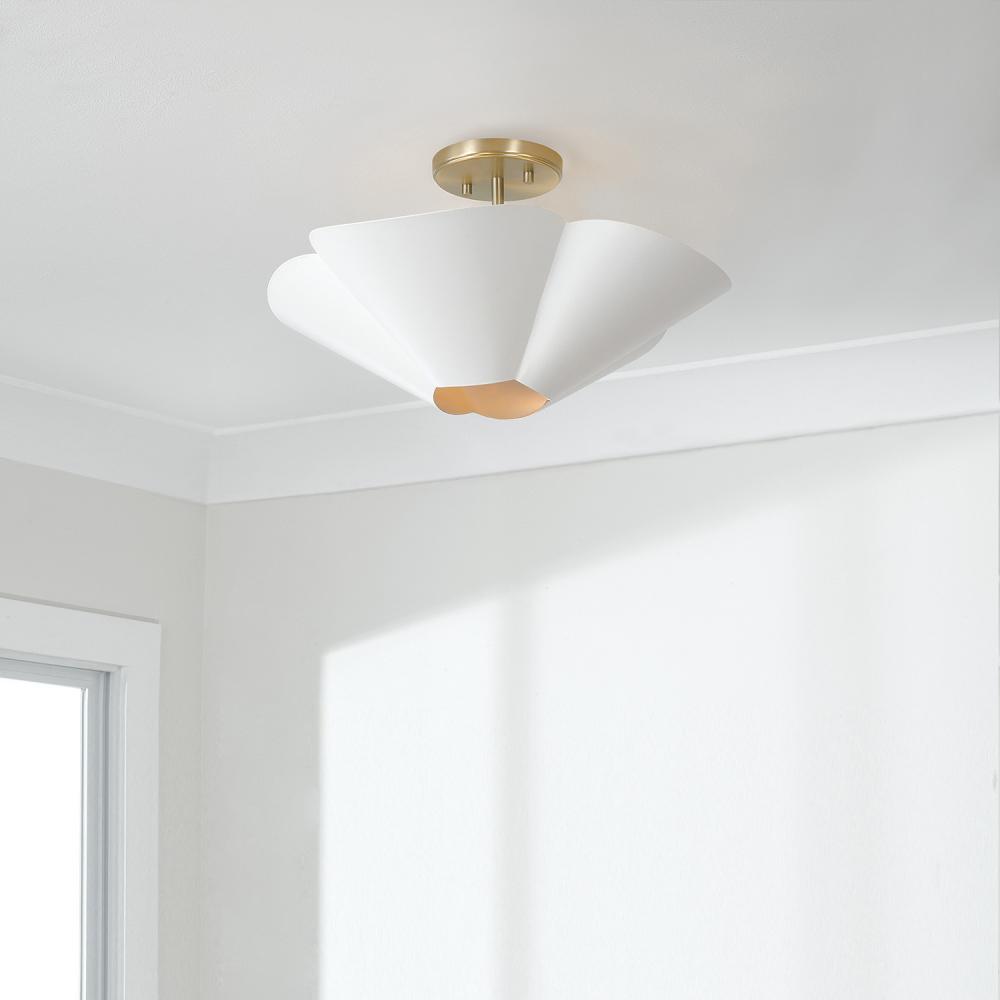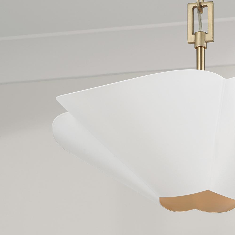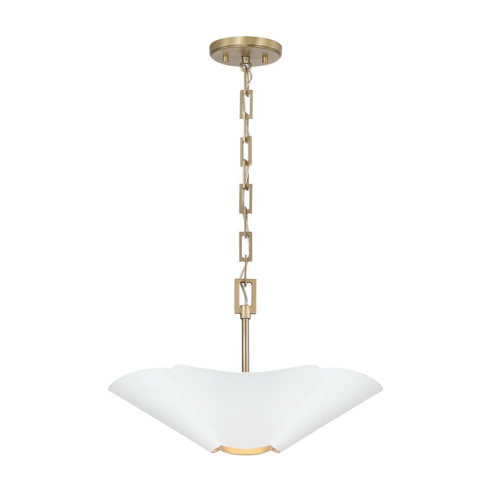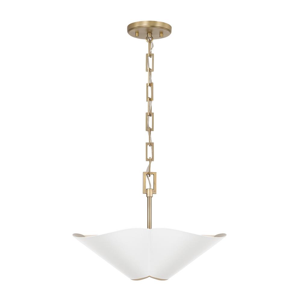 DETAILS: The flower-like form illuminates chic style, perfectly complemented by the designer chain and two-tone Matte White and Matte Brass finish. Can be hung as a pendant or semi-flush.
