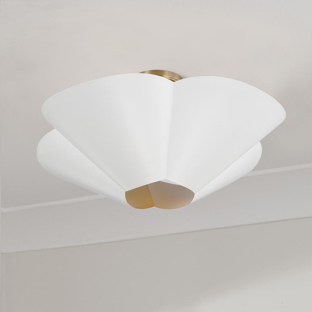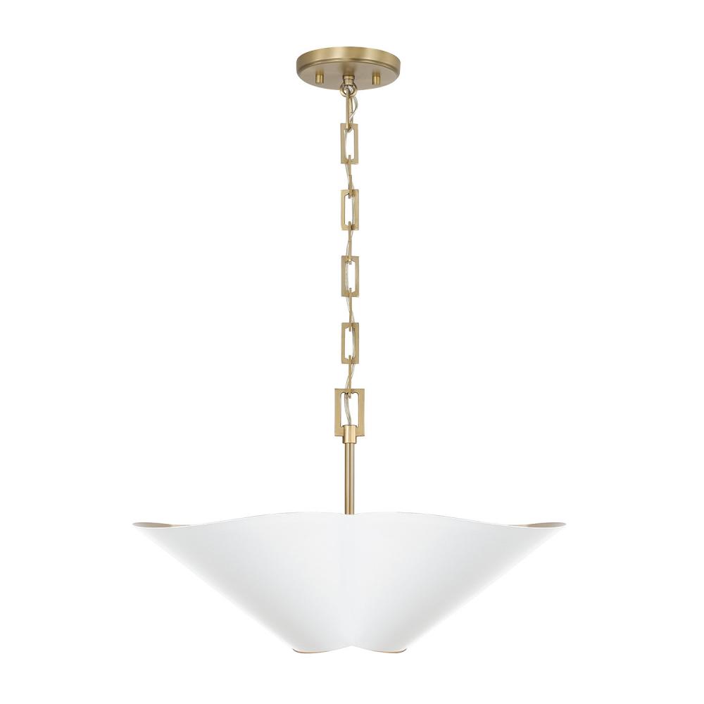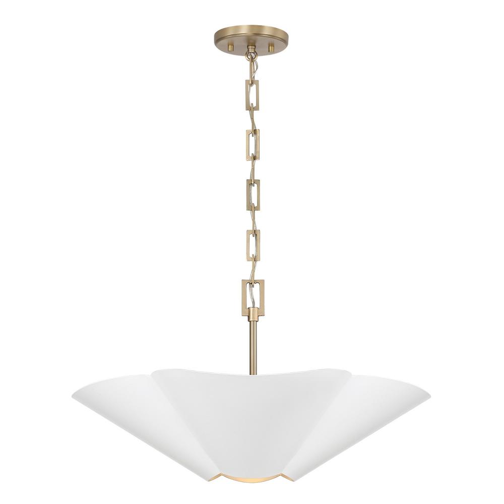 DETAILS: The flower-like form illuminates chic style, perfectly complemented by the designer chain and two-tone Matte White and Matte Brass finish. Can be hung as a pendant or semi-flush.