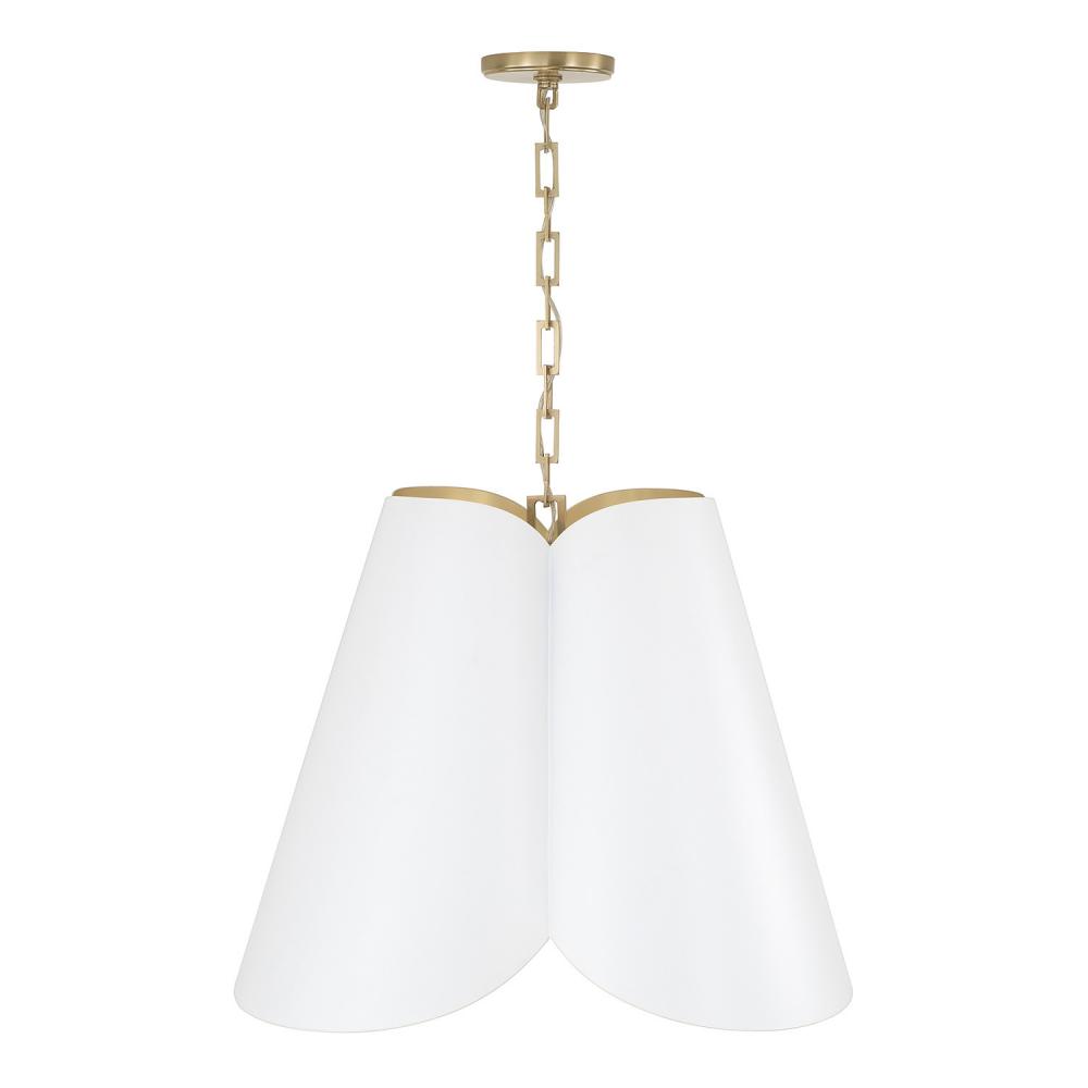 Invite all-around chic style with the Maeve Pendant. The subtle curvature of the petal-like shade evokes a botanical feel, enhanced by the rectangular-shaped designer chain and sophisticated two-tone finish of smooth Matte White and painted Matte Brass interior.