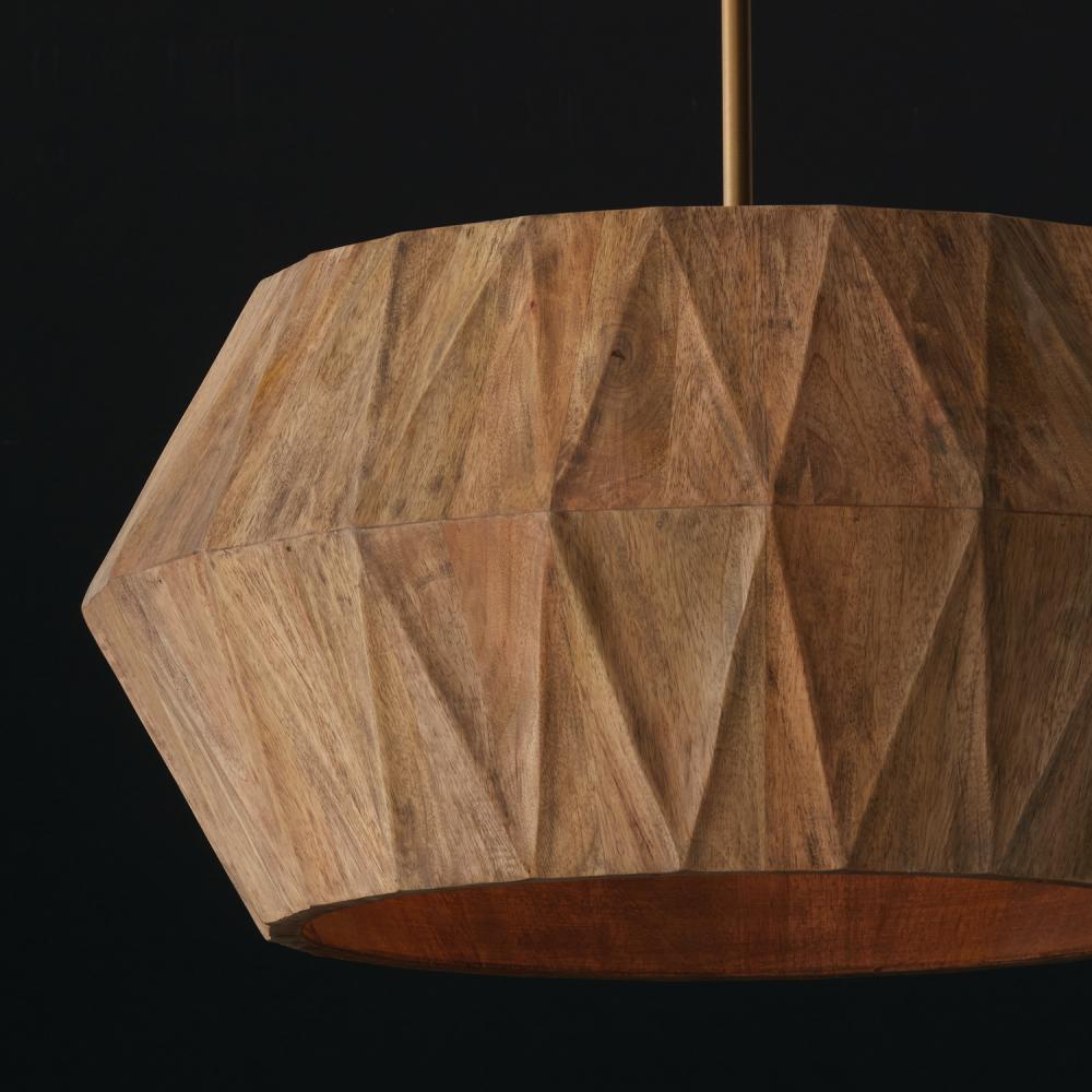 Handcrafted of mango wood, the Nadeau Pendant creates a naturally fascinating luminaire. The angular silhouette and geometric texture paired with the hand-distressed Patinaed Brass create intriguing dimension from every angle.
