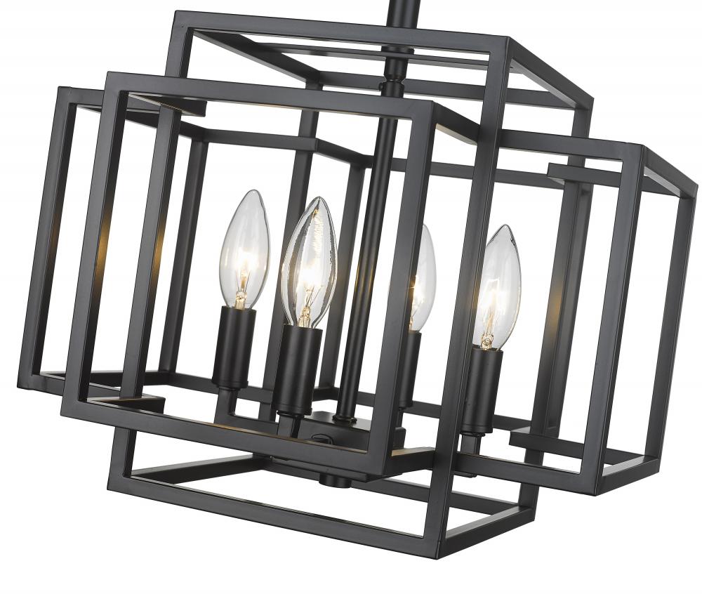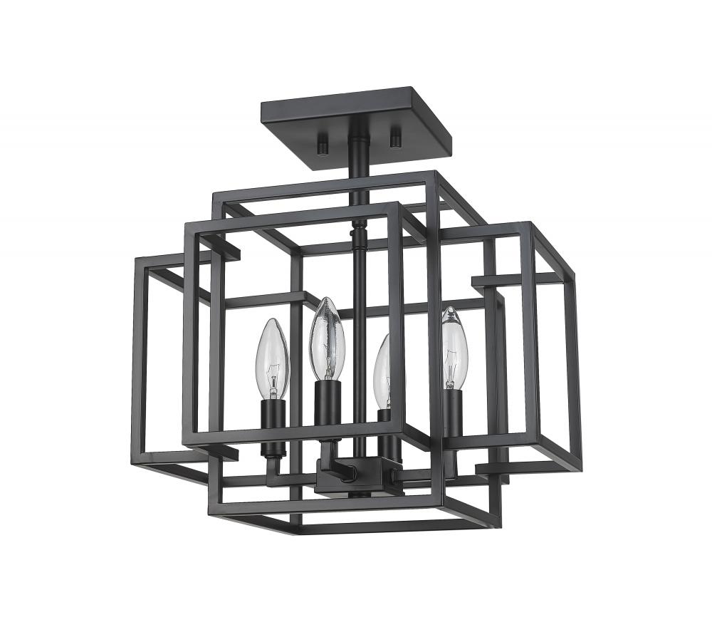 Add a warm glow to a contemporary interior with this Arts and Crafts era-inspired modern semi-flush mount, featuring a multi-dimensional open frame steel cage that surrounds an exposed candelabra style light fixture. With a dramatic silhouette brought on by the audacious bold matte black finish steel cage, this modern four-light semi-flush mount makes a wonderful minimalist addition to entryway foyers, powder rooms or even small dining nooks, transforming the space with its captivating tesseract-like design. Mount this transitional semi-flush mount with easy on-the-eyes Edison style bulbs for a soothing glow and ambiance.