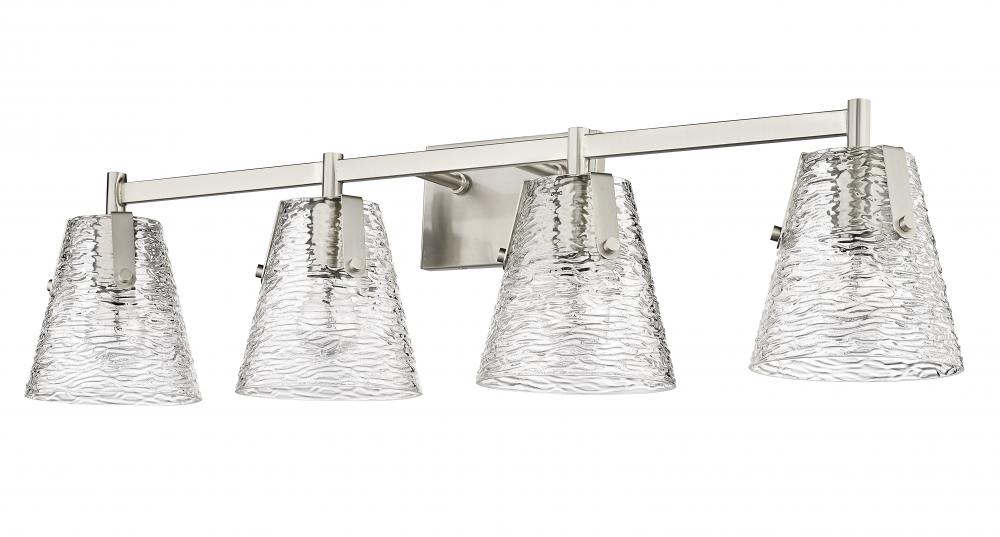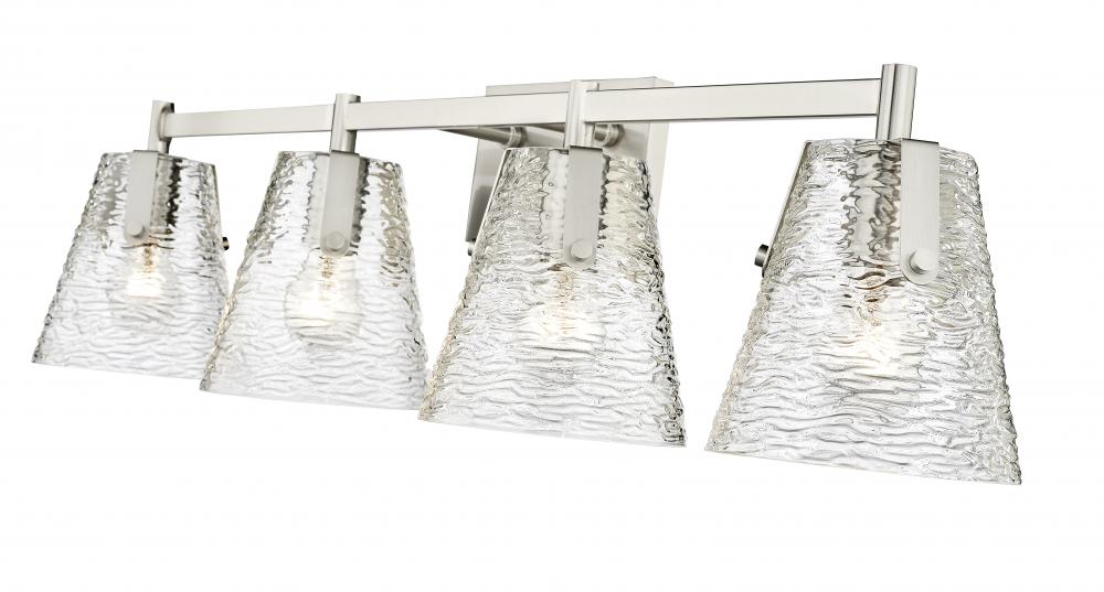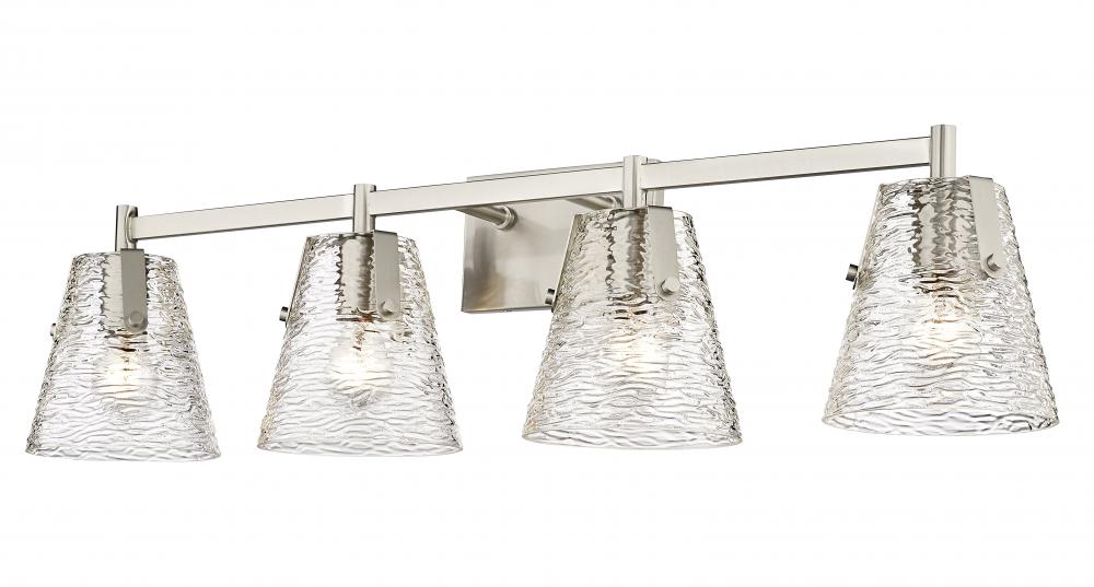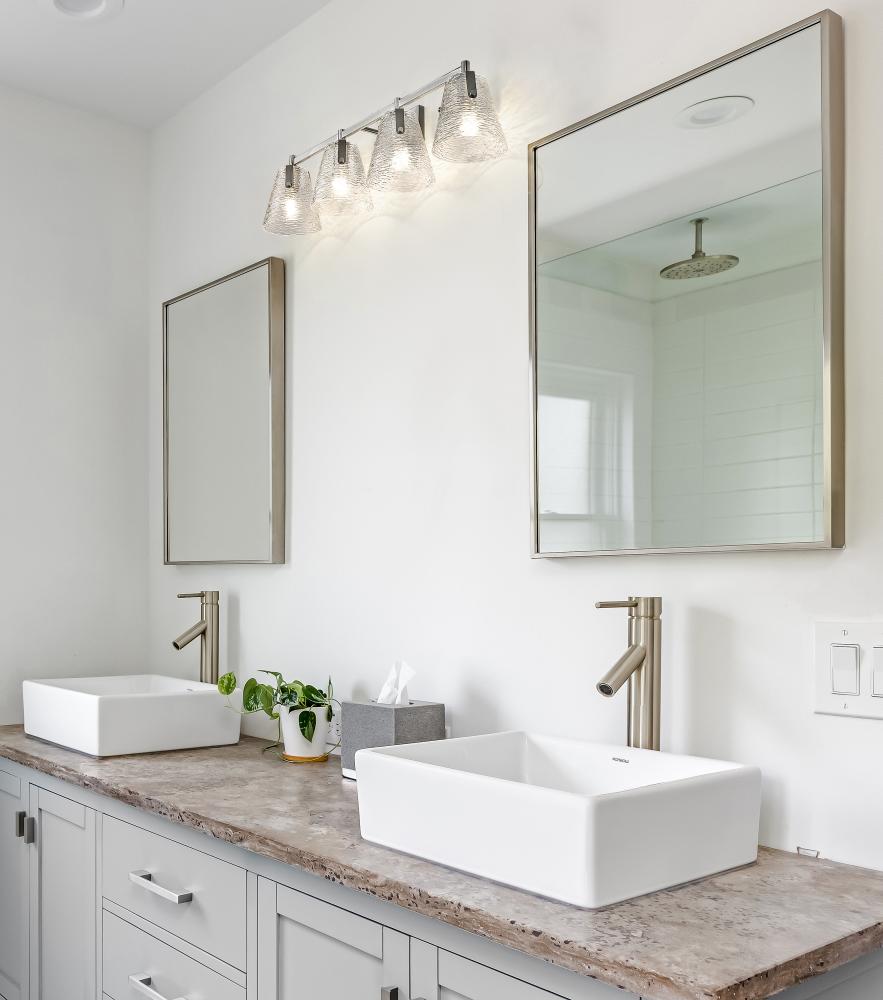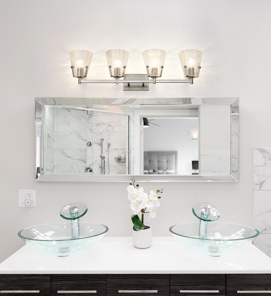 Evoking the look of sunlight dancing on waves, the textured surface on the Analia vanity series handblown glass shades underscores the spa-like feeling. Available in 1- to 5-light versions and a choice of Brushed Nickel, Chrome, Matte Black, or Modern Gold
