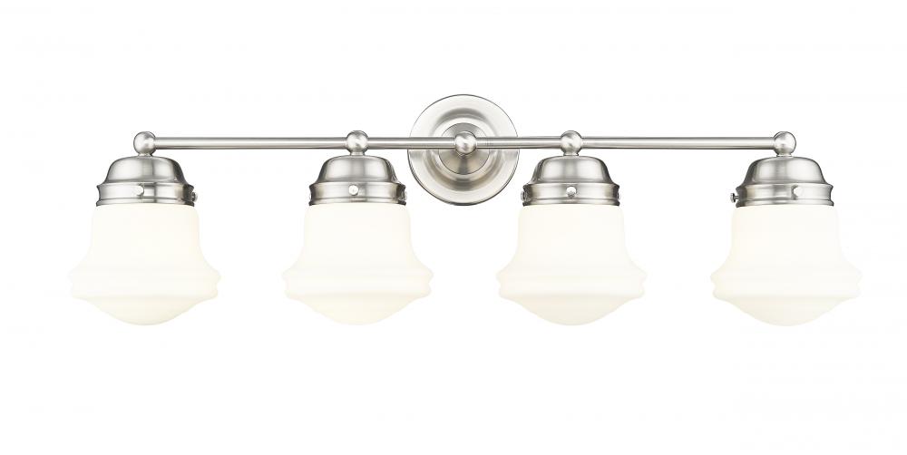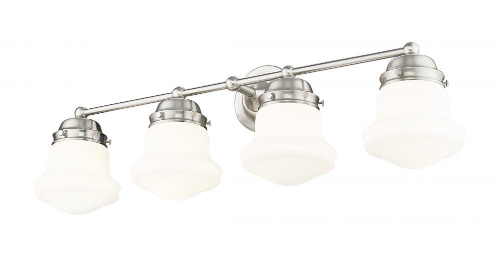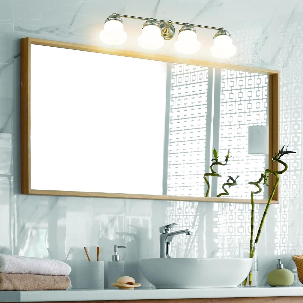 A modern four-light vanity light is infused with vintage charm, owing to its schoolhouse glass and graceful curves. The delightful design features a gleaming brushed nickel finish that highlights its depth and detail, with matte opal glass that ensures true but diffused illumination perfect for daily grooming and beauty rituals at your vanity.