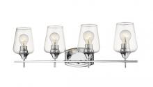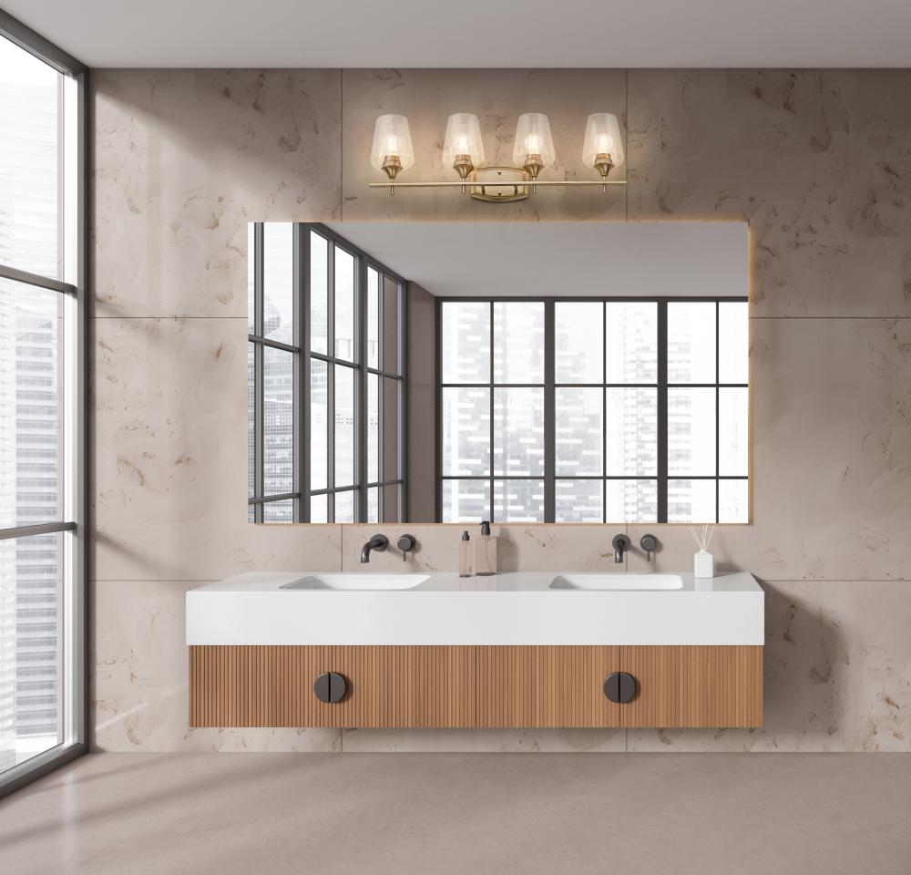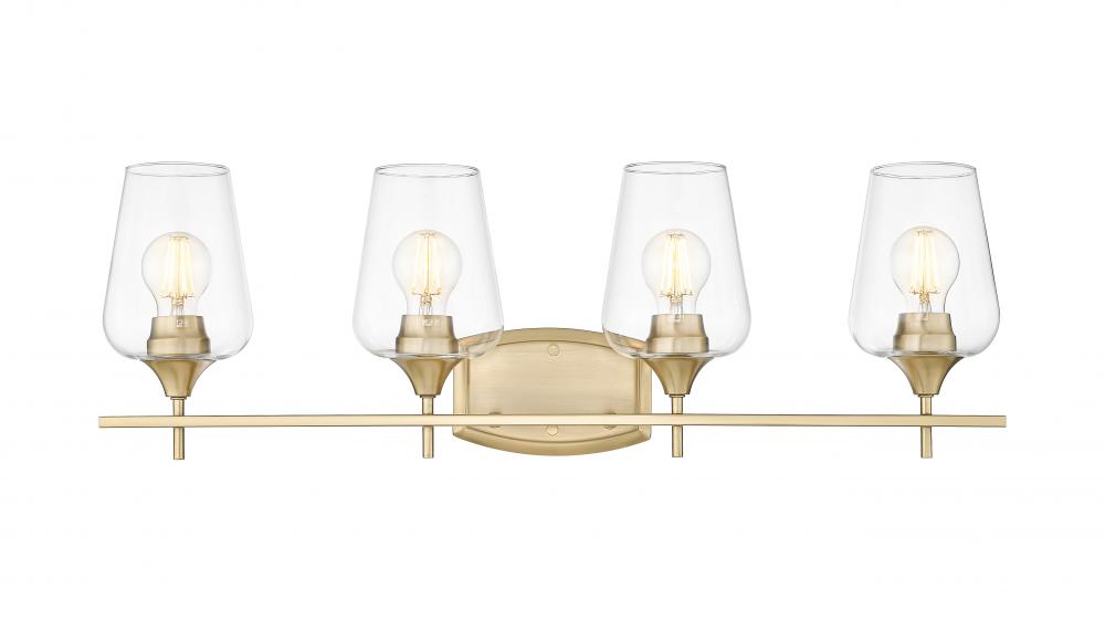 A timeless marriage of glass and metal fits the mood in elegant settings with a four-light vanity light that illuminates master or guest bath spaces. Burnished brass finish steel construction is sophisticated and stylish, welcoming a row of four delicate clear glass goblet shades. Light dims with a built in dimming feature creating customized levels of illumination for day-and-night functions.