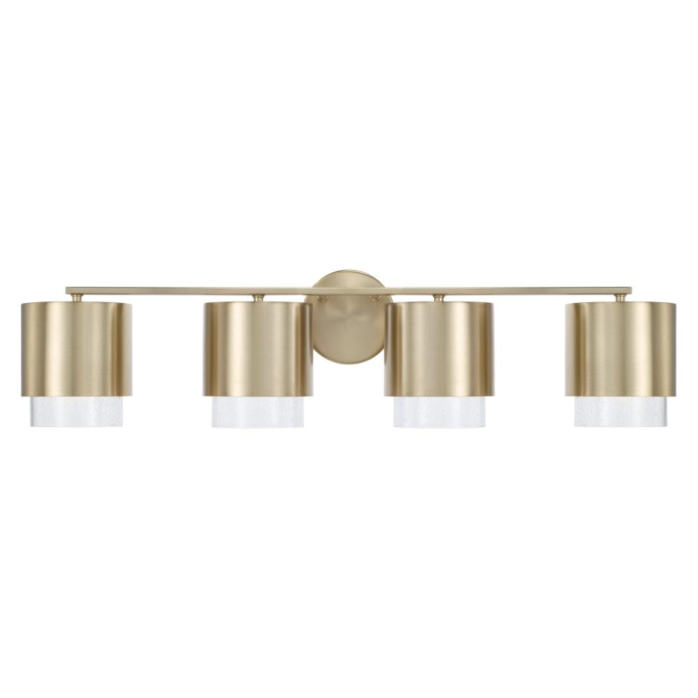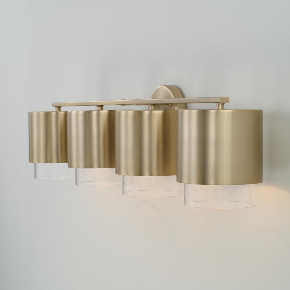 Contemporary forms meet illuminated elegance. The Weller 4-Light Vanity combines sleek, cylindrical silhouettes with seeded glass to cast a unique powder room glow. The Matte Brass finish brings a hint of warmth and subtle shine.