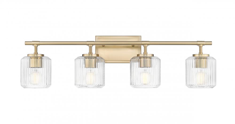 The warmth of a modern gold finish is a perfect complement to the clean-lined design of this contemporary four-light vanity bath light. Its rectangular wall plate and straight arm create a sense of structure, while ribbed glass shades sparkle in the light. Their subtle design offers undulating flair, perfect for elevating your vanity or bath.