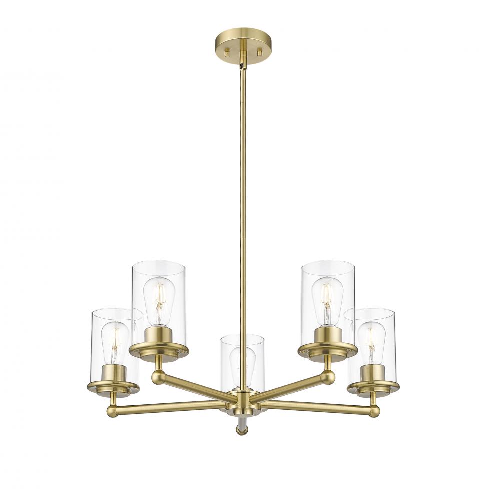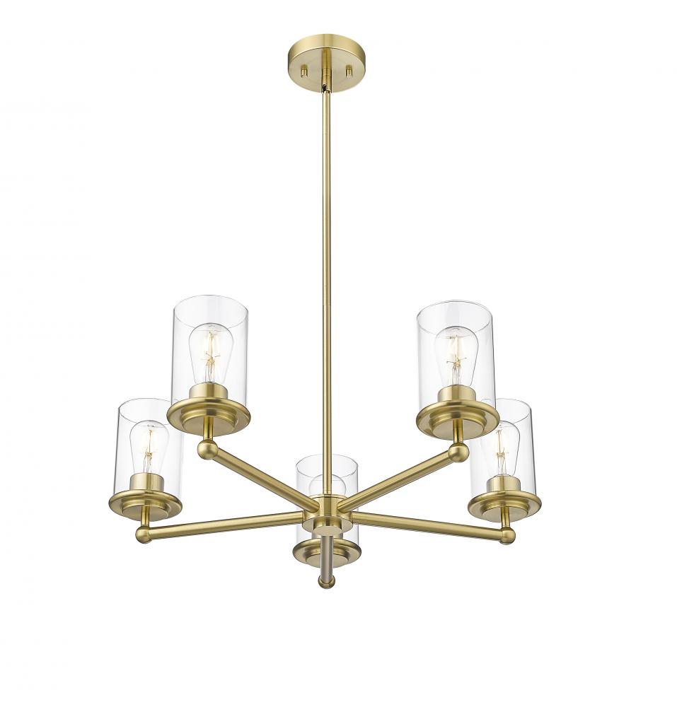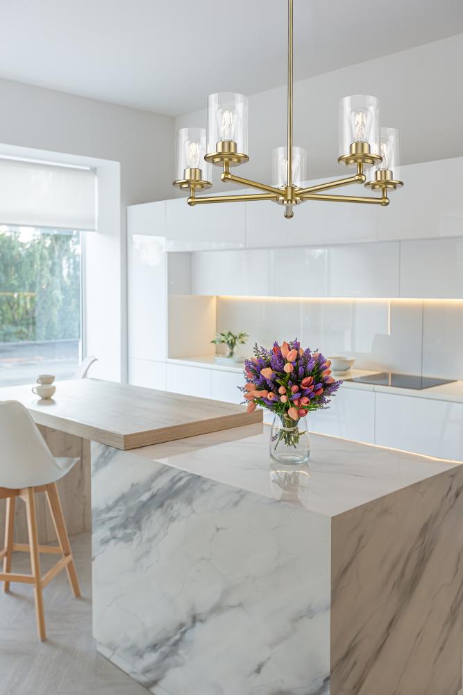 Complete a timeless kitchen or living area with the understated flair of a modern five-light chandelier from the impeccable Thayer collection. Clean lines and gentle curves highlight its silhouette, with cylinders of smooth, clear glass surrounding each light and offering a light, airy ambiance over a breakfast nook or entryway. A refined luxe gold finish adds the perfect touch of sleek sophistication.